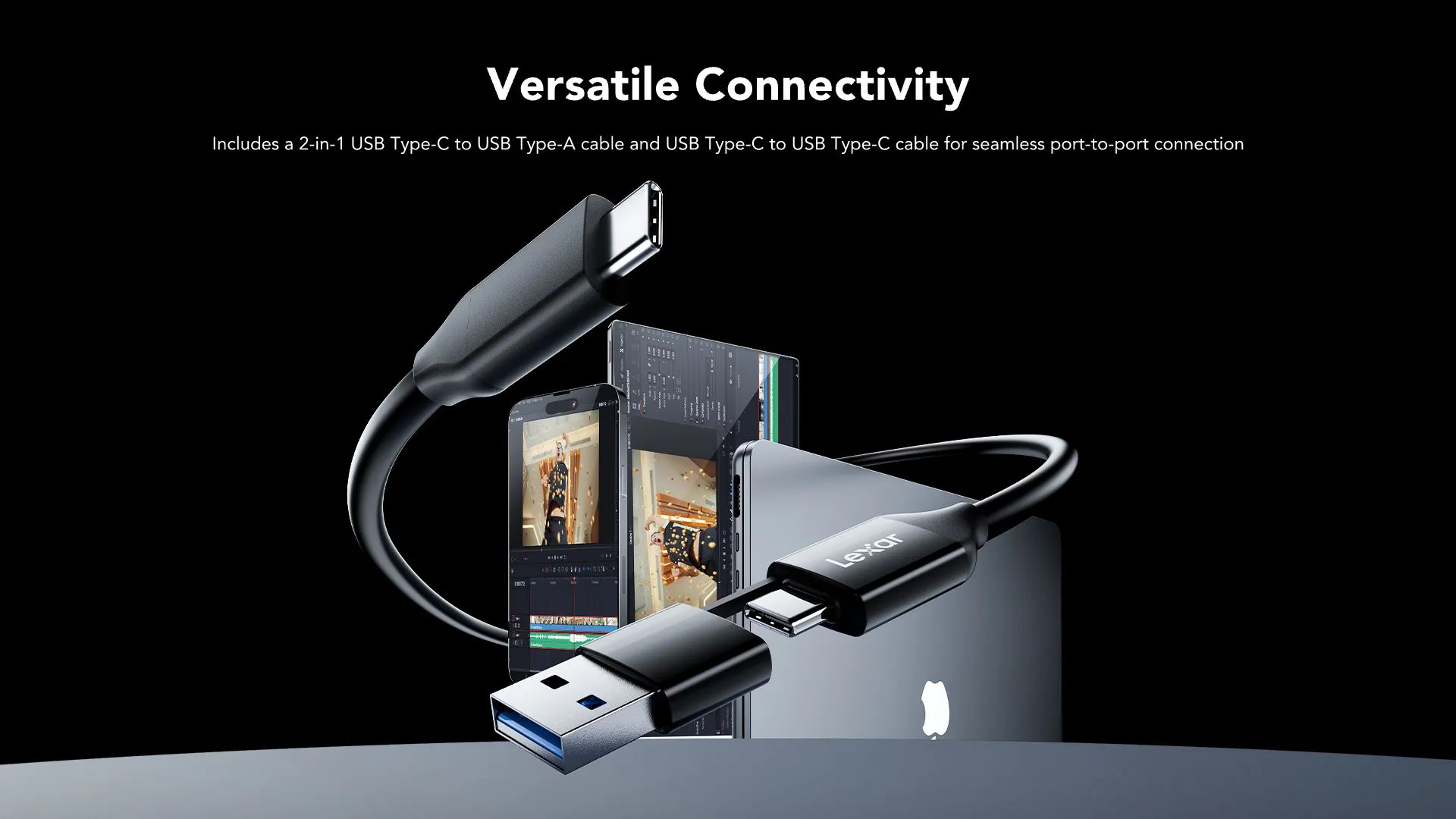 Wszechstronna łączność: Czytnik wyposażony jest w kabel 2-w-1 USB Typ-C na USB Typ-A oraz USB Typ-C na USB Typ-C, co zapewnia elastyczne połączenia z laptopami i komputerami.