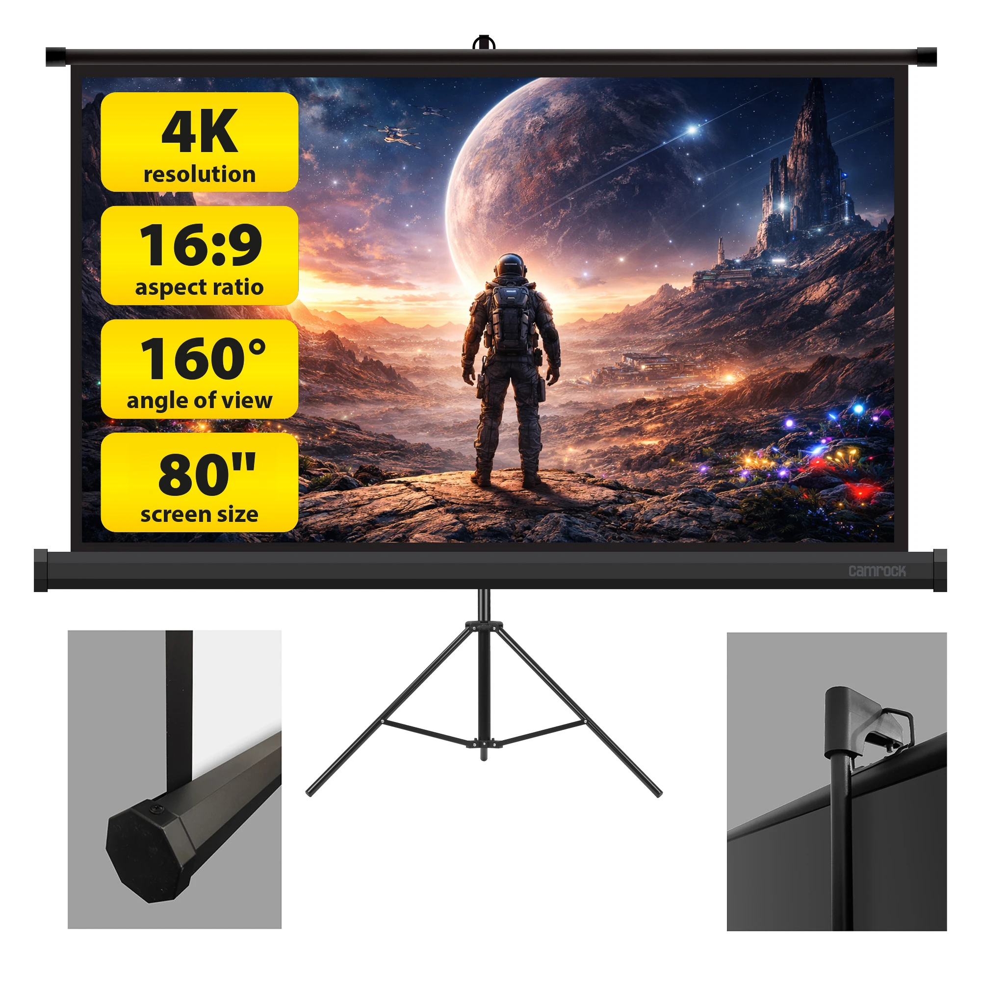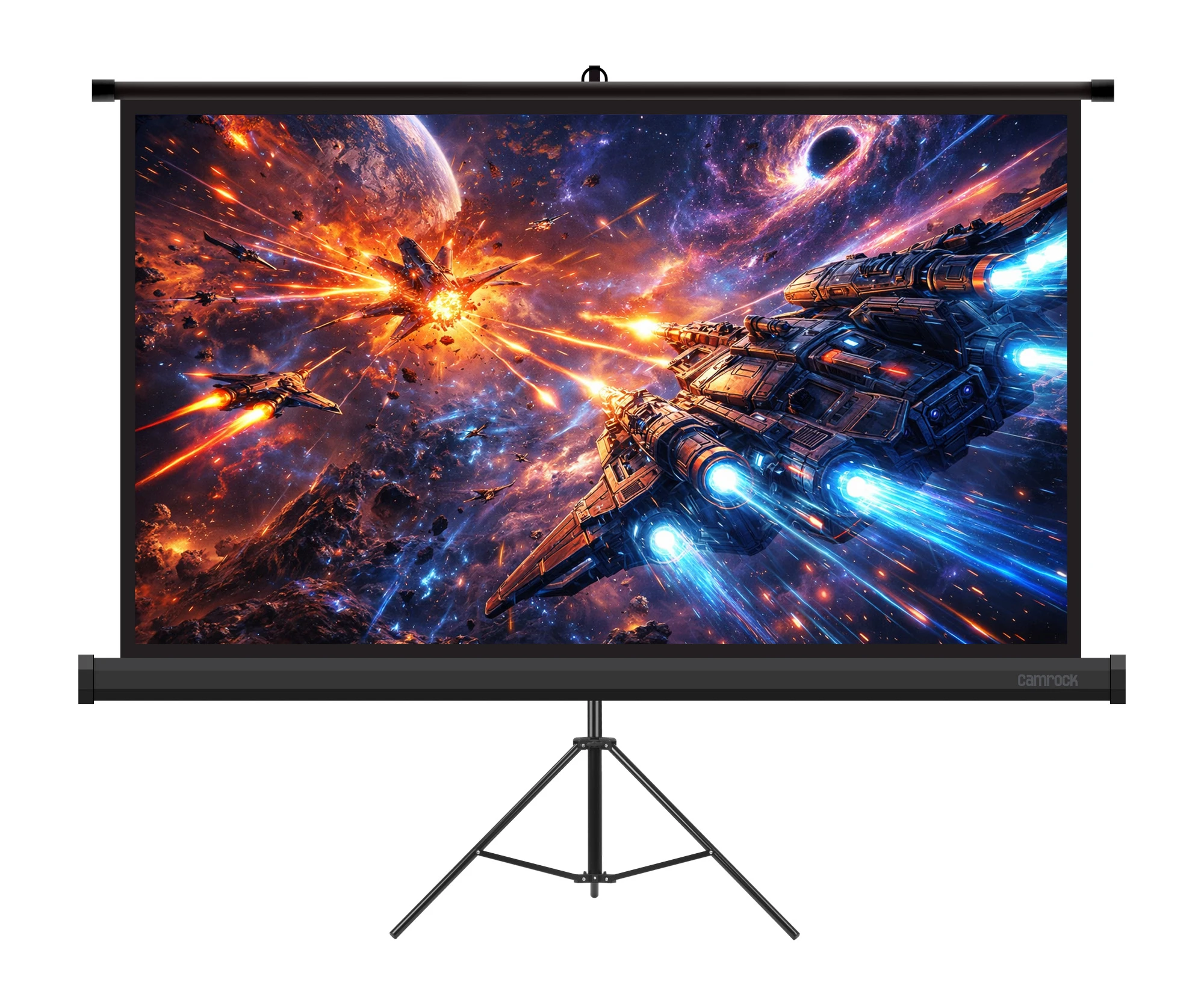 Camrock Matte T 80 to wszechstronny ekran projekcyjny o przekątnej 80 cali, przeznaczony do użytku zarówno w pomieszczeniach, jak i na zewnątrz. Dzięki lekkiej konstrukcji i statywowi ze zintegrowaną rączką jest wyjątkowo mobilny i prosty w obsłudze – nie wymaga instalacji na ścianie lub pod sufitem. Matowa biała powierzchnia ekranu z kątem widzenia 160° i współczynnikiem odbicia 1.0 zapewnia jasny i wyraźny obraz. Automatyczny system blokowania pozycji gwarantują idealne napięcie materiału. Regulacja wysokości statywu pozwala dopasować urządzenie do różnych przestrzeni. To niezawodne rozwiązanie do prezentacji, szkoleń, kina domowego i pokazów plenerowych.