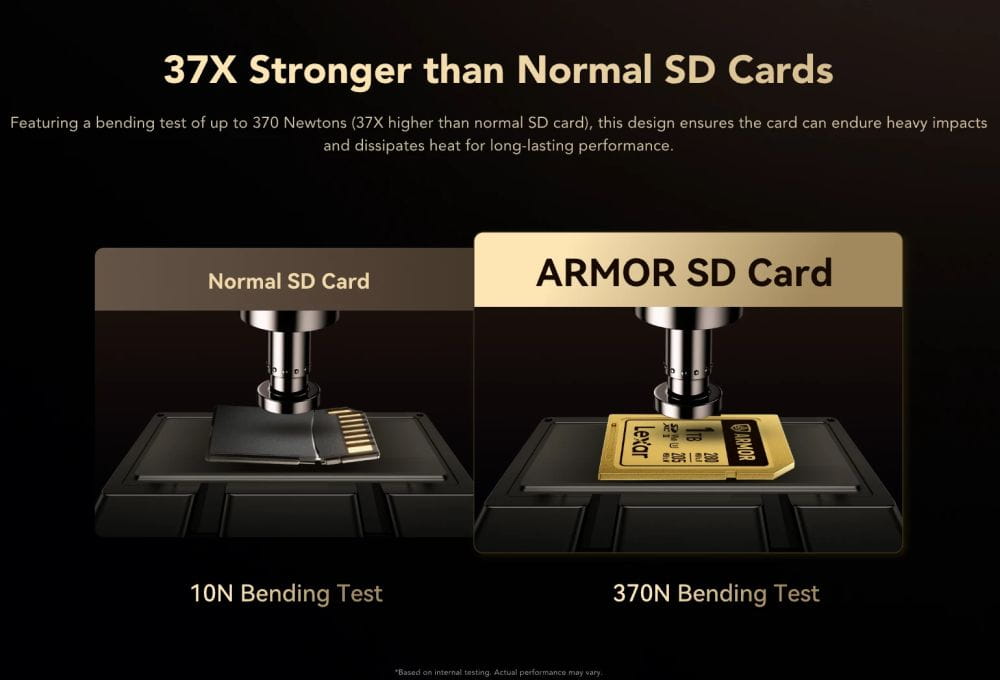 Karta Lexar ARMOR Gold została wyposażona w wytrzymałą obudowę wykonaną ze stali nierdzewnej, która zapewnia odporność na zginanie, uderzenia oraz upadki. Konstrukcja ta jest 37 razy mocniejsza niż standardowe karty SD, co czyni ją idealnym rozwiązaniem dla profesjonalistów pracujących w trudnych warunkach terenowych.