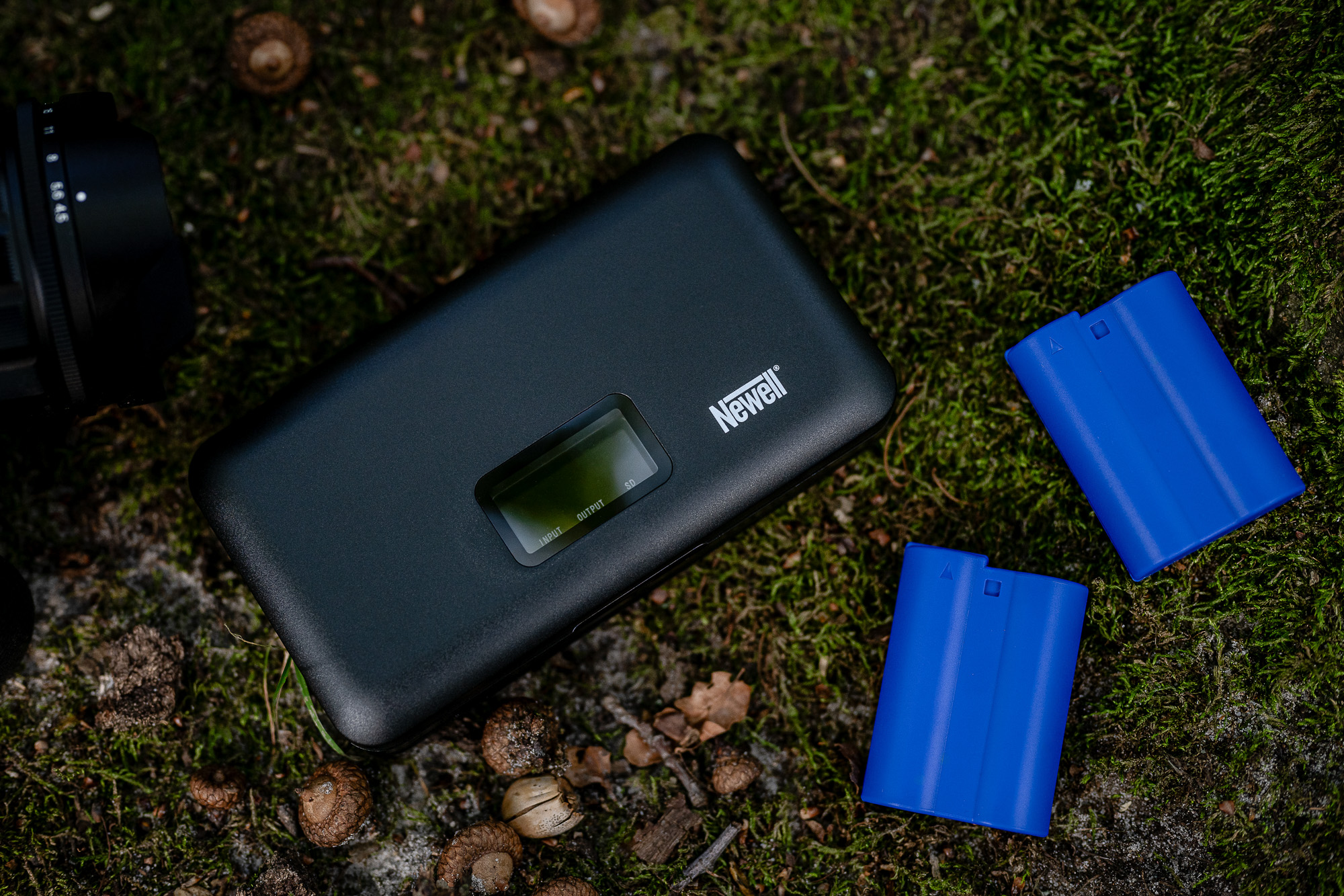 - ładowarka dwukanałowa Newell LCD z funkcją power banku i czytnikiem kart SD do akumulatorów BLS-5 do Olympus