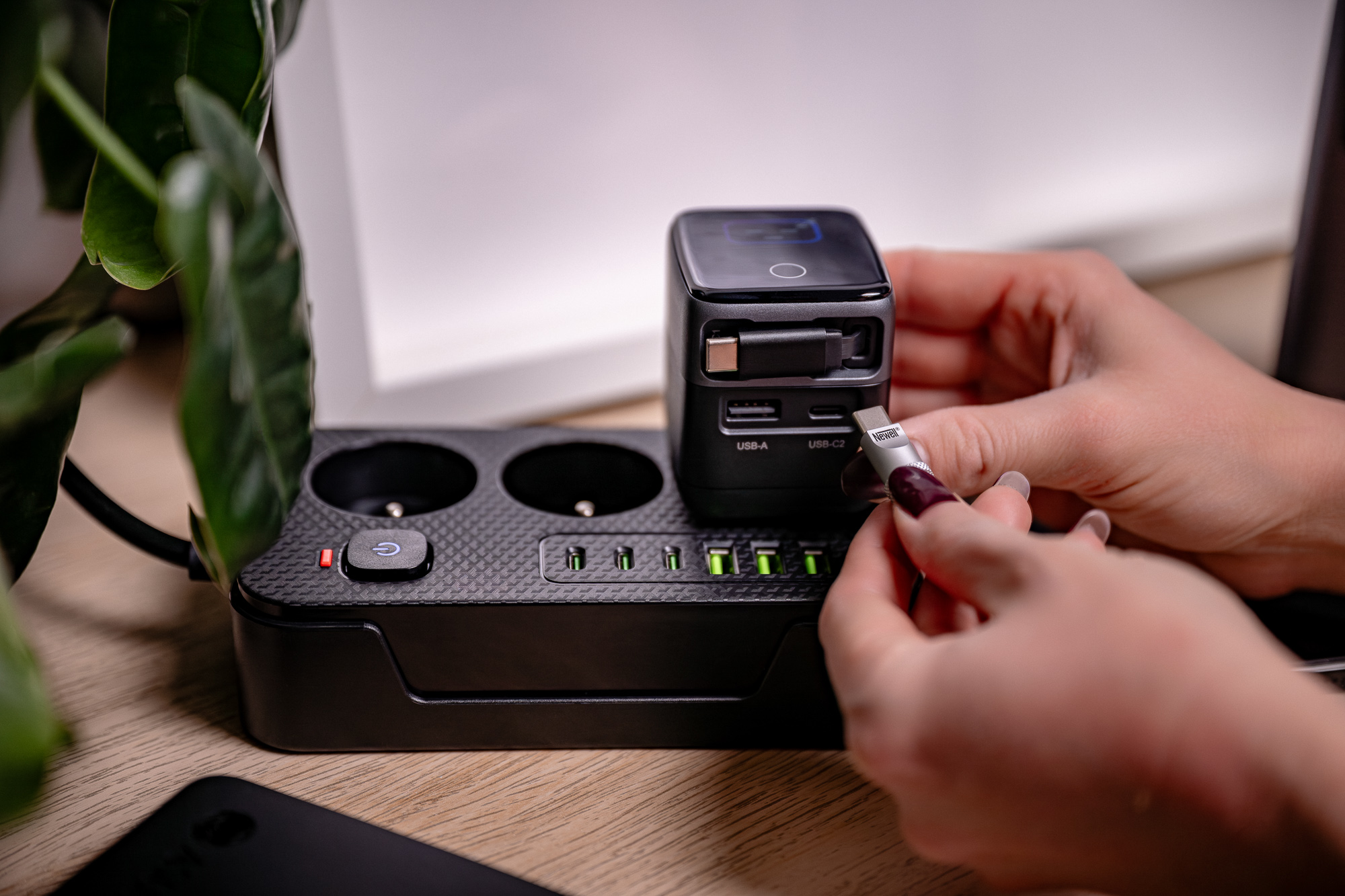 Kable służące do ładowania podręcznej elektroniki mają to do siebie, że lubią się gubić. Na szczęście z tą ładowarką ten problem nie istnieje. Na pokładzie znajdziesz kabel USB-C o długości 80 cm, który jest na stałe zintegrowany z urządzeniem. Dzięki płynnej regulacji długości możesz go dowolnie wysuwać lub chować w obudowie. Wystarczy jedno pociągnięcie, by naładować smartfon, słuchawki lub czytnik e-booków. Magnetyczne mocowanie sprawia, że po zwinięciu, wtyk USB-C zawsze trafia na swoje miejsce.