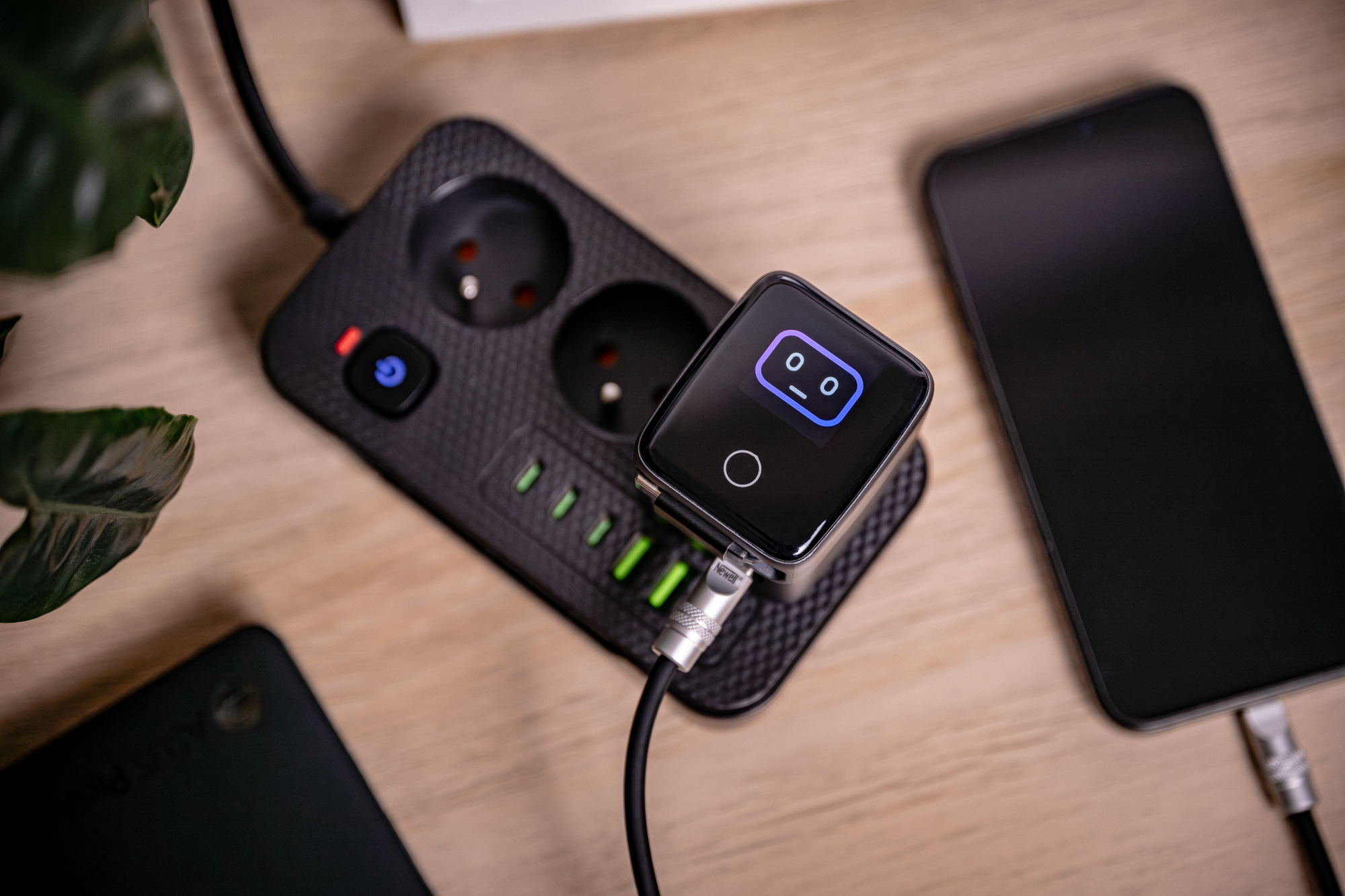 Ładowarka Newell GaN 70 W TFT została wyposażona w duży, wyraźny i podświetlany ekran TFT, który zapewnia kontrolę nad procesem ładowania. Za pomocą jednego przycisku możesz przełączać między różnymi trybami widoku – od podstawowego stanu gotowości, przez aktualny pobór mocy (całkowity lub z podziałem na poszczególne porty), aż po temperaturę pracy i łączny czas użytkowania urządzenia. Przytrzymanie przycisku umożliwia obrócenie wyświetlanych treści o 180 stopni. Dzięki temu dostosujesz orientację ekranu do tego, jak ładowarka została wpięta do gniazdka. To drobny, ale przemyślany detal, który znacząco poprawia komfort użytkowania.