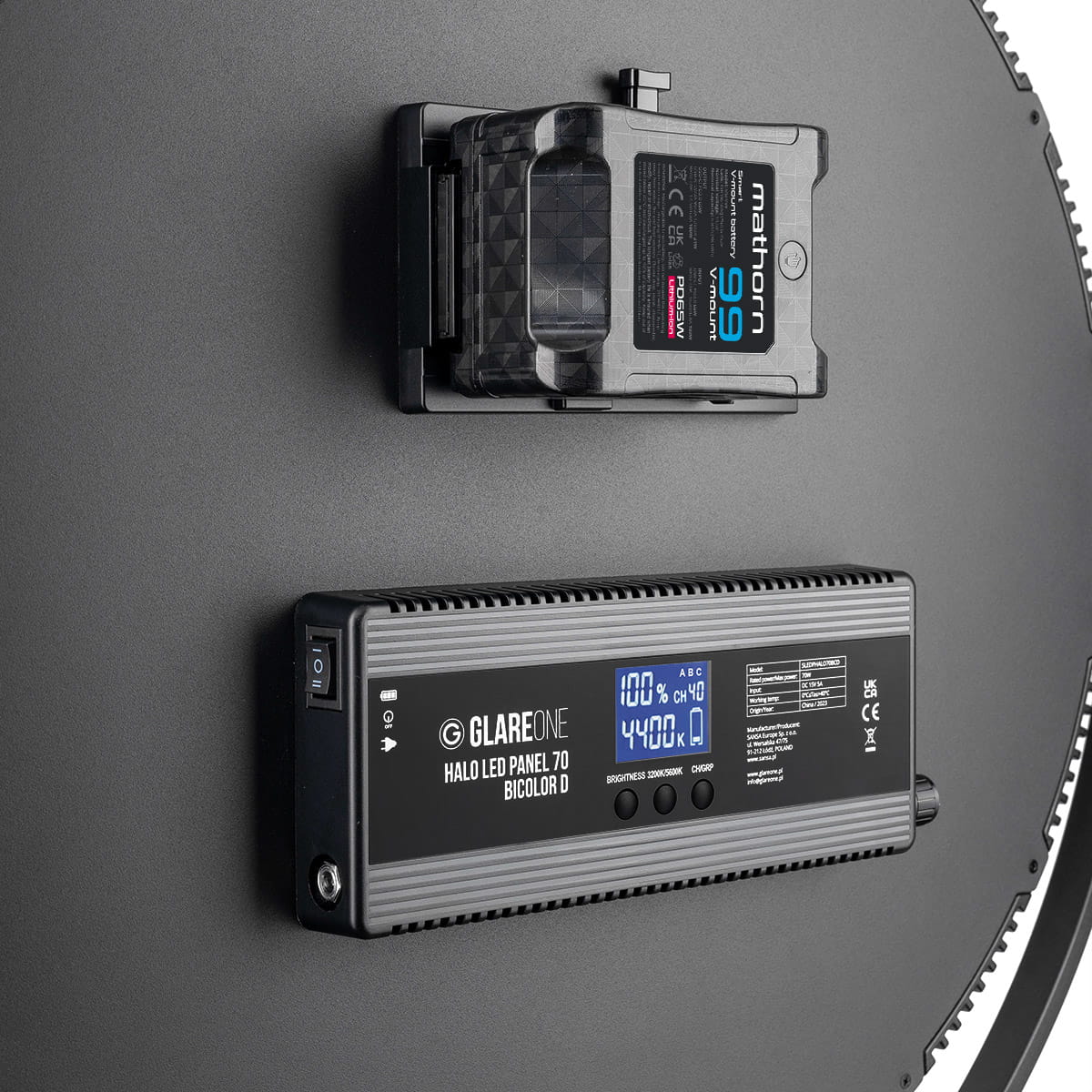 Lampy GlareOne Halo LED Panel 35, 70 i 110 BiColor D można zasilać na dwa sposoby – poprzez gniazdko sieciowe przy użyciu dołączonego adaptera zasilającego lub za pomocą akumulatorów typu NP-F (Halo LED Panel 35W) lub V-mount (Halo LED Panel 70W i 110W). Akumulatory nie są dołączone do zestawu.