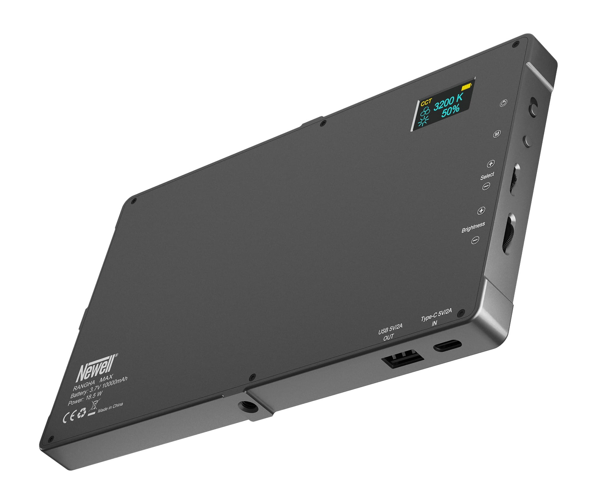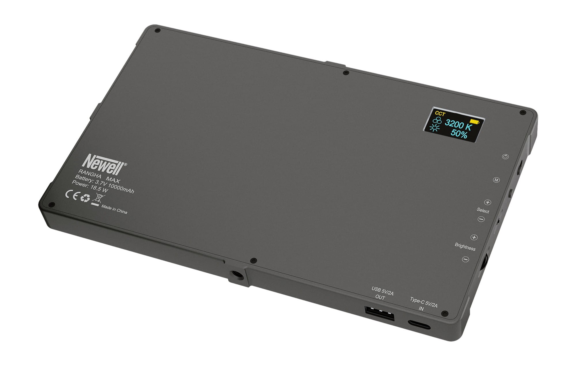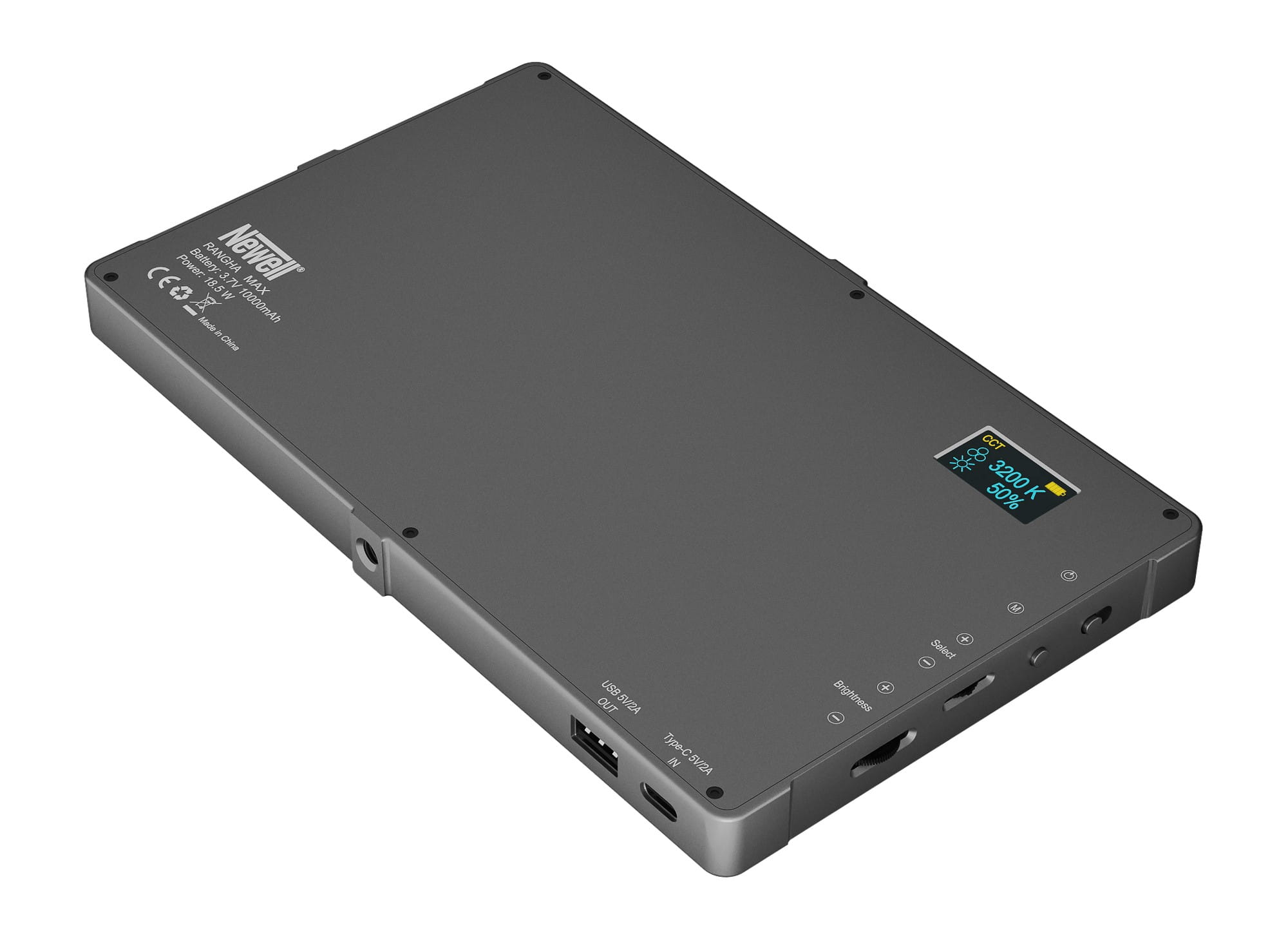 Lampę LED Newell RGB-W Rangha Max wyposażono w przeszło 2 razy bardziej pojemny akumulator, w porównaniu do starszej siostry. 10000 mAh pozwoli korzystać z przenośnego źródła światła do 3 godzin na jednym ładowaniu! Na obudowie urządzenia, oprócz portu USB-C pozwalającego uzupełniać moc lampy, umieszczono także gniazdo USB. Dzięki niemu zamienisz lampę w powerbank i z łatwością naładujesz swój smartfon, słuchawki lub inne akcesoria towarzyszące Ci na planie zdjęciowym lub fotograficznym.
