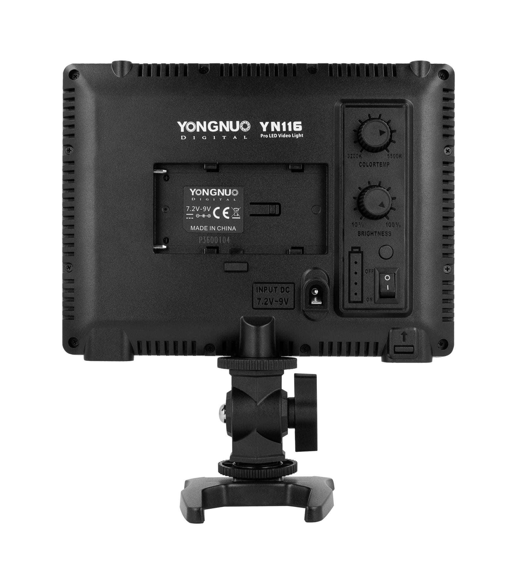 YN116 zasilana może być przy pomocy akumulatorów z serii NP-F lub przy użyciu zasilacza sieciowego (akumulator oraz zasilacz nie są częściami zestawu). Dzięki temu lampa idealnie sprawdzi się zarówno w studio, jak i w terenie. Podczas pracy na akumulatorze o jego aktualnym poziomie naładowania informuje diodowy wskaźnik umieszczony obok włącznika lampy.