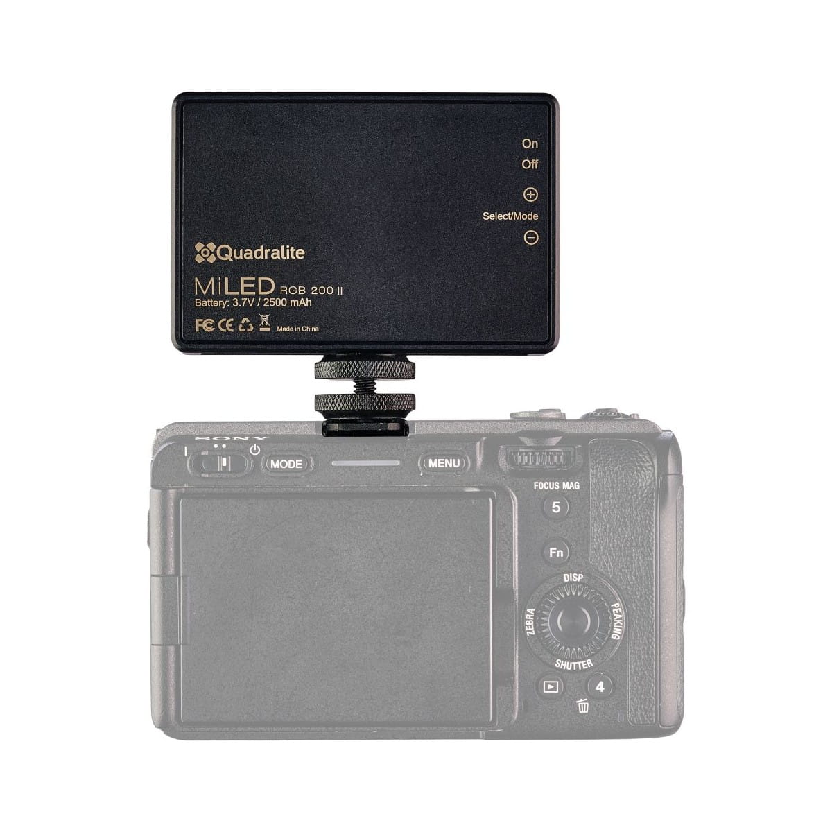 Quadralite MiLED RGB 200 II to niewielkie, ale niezwykle efektywne źródło światła wyposażone w 60 diod LED RGBAW. Maksymalna moc lampy wynosi 10 W, a współczynnik odwzorowania barw (CRI) wynosi ≥ 96, co gwarantuje doskonałą jakość oświetlenia. Lampa umożliwia płynną regulację koloru w zakresie od 0 do 360 stopni oraz regulację nasycenia i mocy świecenia od 0 do 100%. Dodatkowo lampa zapewnia 10 różnych animowanych efektów świetlnych, takich jak symulacja świateł policyjnych, błyskawic, fajerwerków, telewizji itd.