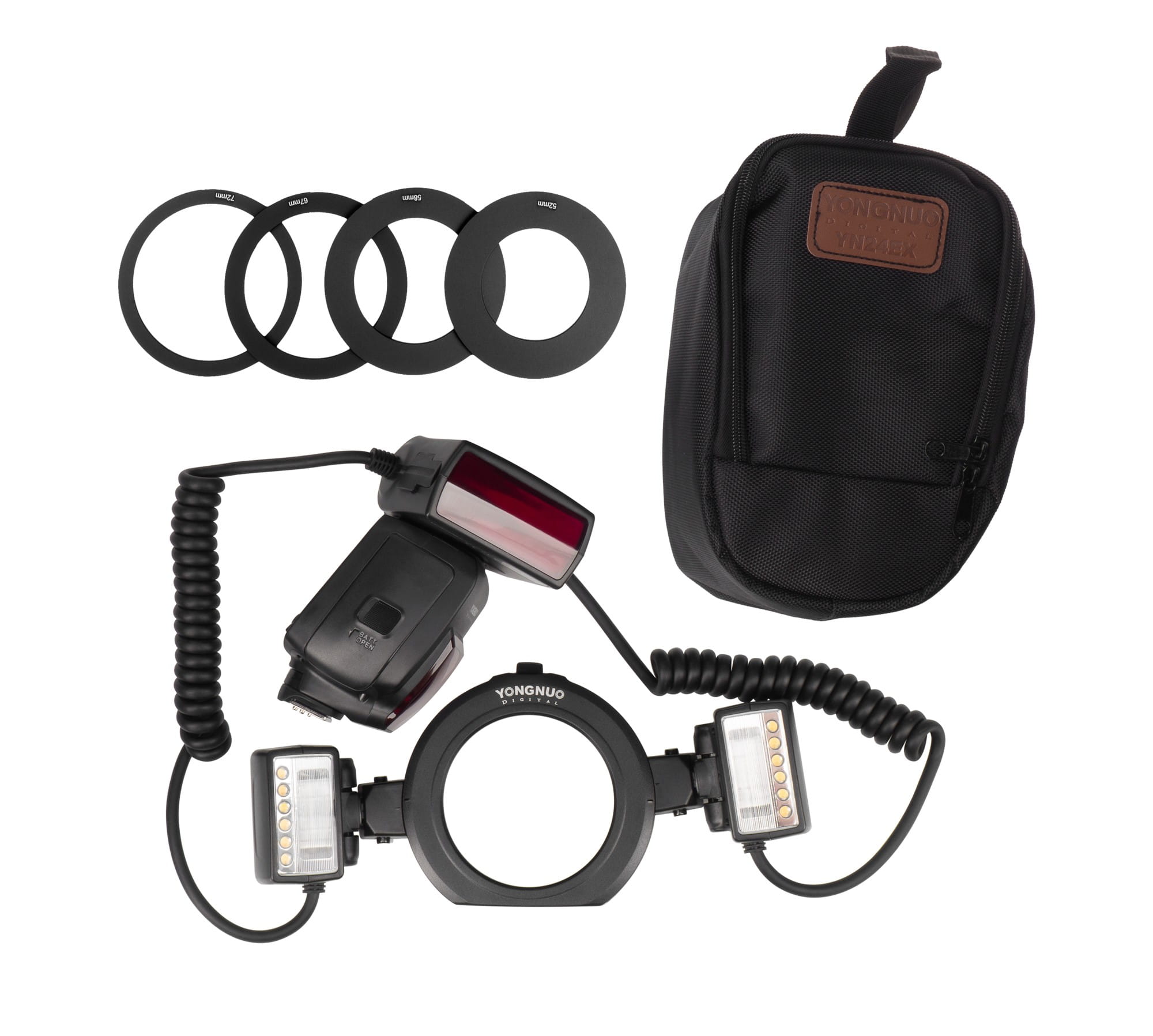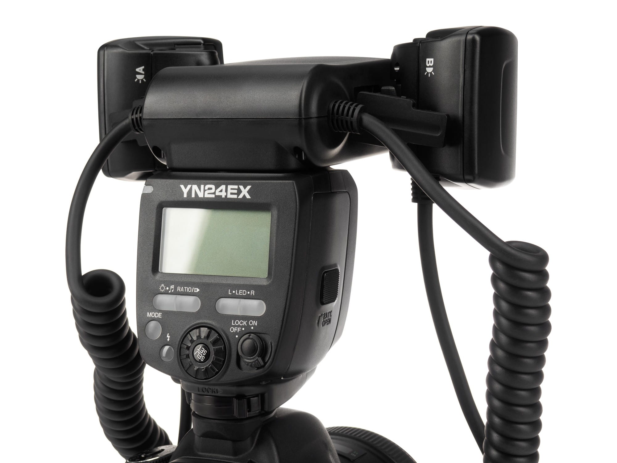 YN24EX oferuje ogromne możliwości konfiguracji, dzięki czemu oświetlenie można idealnie dostosować do każdej sytuacji. Mobilne głowice lampy połączone zostały z jednostką sterującą za pomocą elastycznych kabli o długości 40-90 cm. Dzięki temu rozwiązaniu możliwy jest montaż głowic, np. na dwóch niezależnych statywach z mocowaniem 1/4". Głowice zamocować można także na jednostce sterującej oraz pierścieniu zakładanym na front obiektywu, a skierowanie światła w pożądanym kierunku ułatwiają ruchome przeguby.