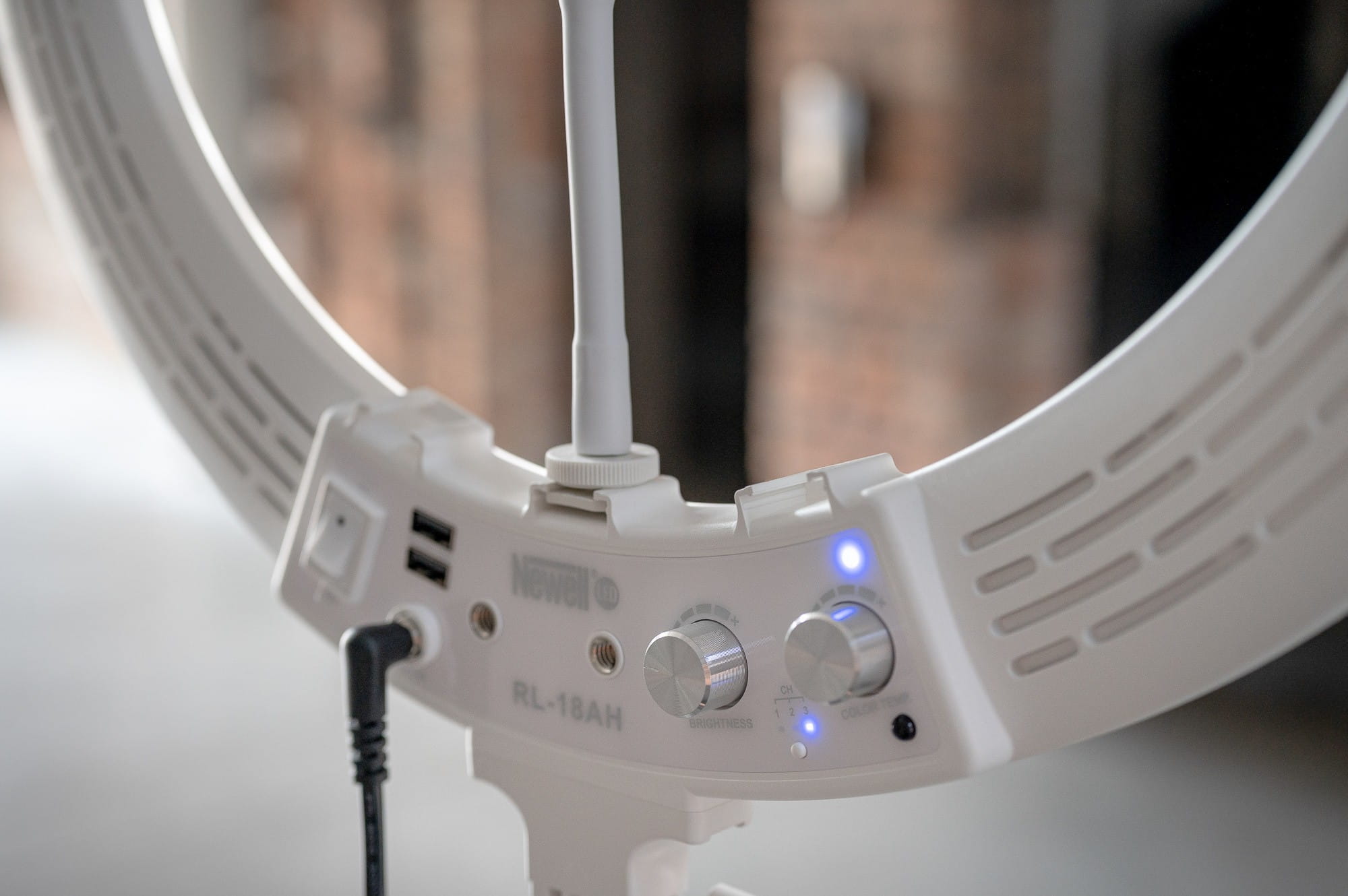 Lampę pierścieniową LED Newell RL-18A wyposażono w dwa porty USB umożliwiające wygodne ładowanie innych urządzeń. Dzięki temu nie musisz martwić się o rozładowany akumulator w aparacie lub świecącą się na czerwono ikonę baterii w smartfonie. W razie potrzeby po prostu sięgnij po odpowiedni przewód i podłącz swój sprzęt filmowy do lampy, nie rozglądając się już na boki za powerbankiem lub dodatkowym przedłużaczem.