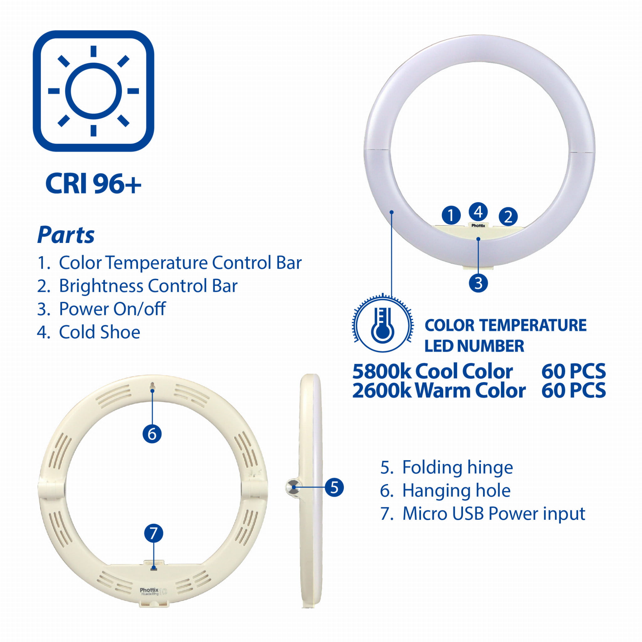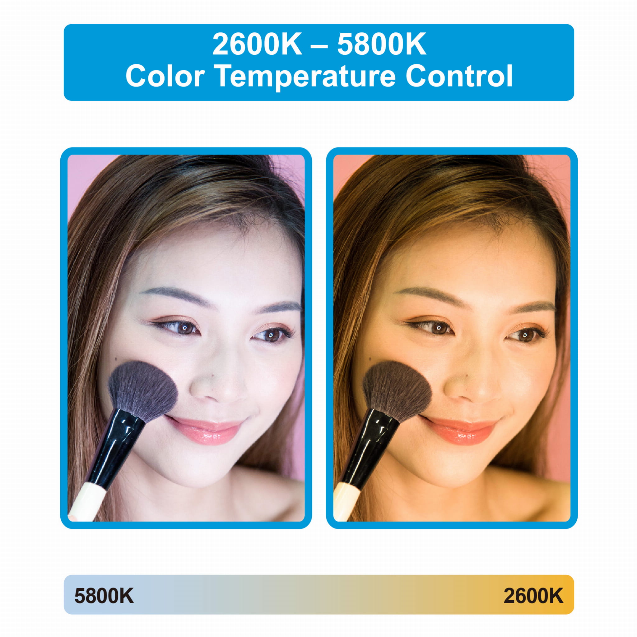 Lampa oferuje płynną regulację jasności oraz temperatury barwowej w zakresie od ciepłego (3200 K) do chłodnego (5600 K) światła, co pozwala łatwo dopasować oświetlenie do warunków i oczekiwanego efektu. Zasilana przez port USB, może być podłączona do powerbanku, laptopa lub ładowarki sieciowej, co zapewnia wygodę użytkowania w dowolnym miejscu.