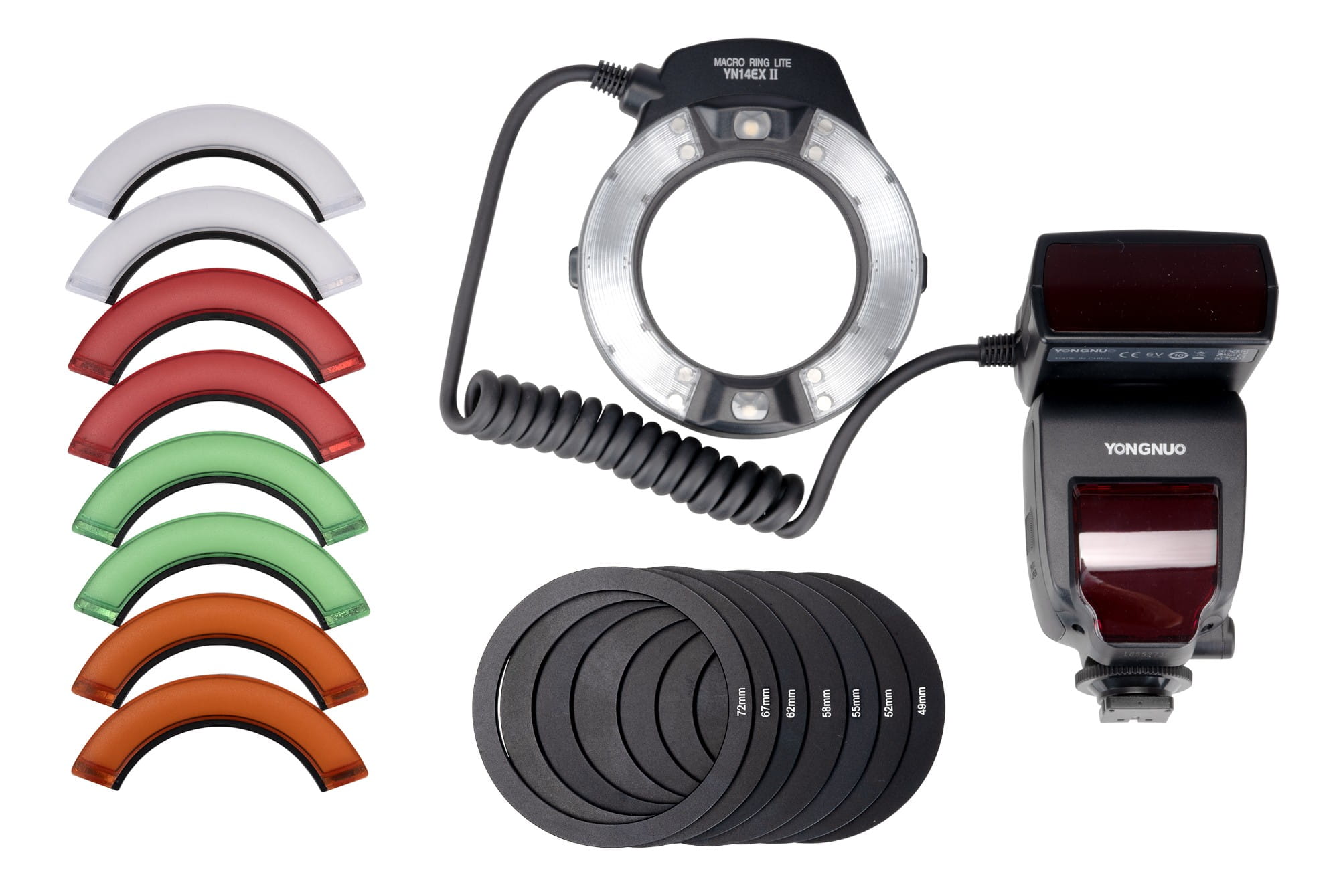 Yongnuo YN14EX II do Sony składa się z dwóch elementów – jednostki sterującej umożliwiającej kontrolowanie parametrów pracy urządzenia oraz wyposażonego w dwa niezależne palniki pierścienia. Drugi z wymienionych modułów możesz zainstalować na gwincie filtrowym, znajdującym się z przodu obiektywu, przy pomocy dołączonych do zestawu adapterów montażowych. Lampa pierścieniowa została połączona z jednostką sterującą za pomocą elastycznego kabla o długości 40-70 cm. Dzięki takiemu rozwiązaniu urządzenie może być kompatybilne z niemal każdym obiektywem, niezależnie od jego rozmiarów.