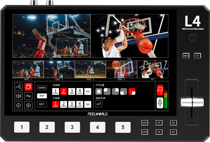 Feelworld L4 to wielofunkcyjne urządzenie do profesjonalnych transmisji i miksowania wideo. Dzięki 4 wejściom HDMI i jednemu SDI umożliwia podłączenie różnych kamer, aparatów czy komputerów, zapewniając dynamiczne przełączanie źródeł wizji za pomocą dotykowego ekranu, przycisków, T‑bara lub zdalnie przez aplikacje.