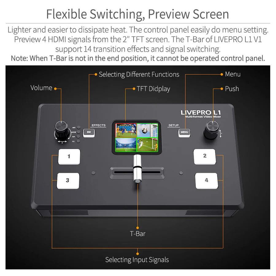 Mikser LIVEPRO L1 jest wyposażony w wyjątkowy, bardzo kompaktowy panel sterowania. Cztery przyciski służą do wyboru źródła sygnału, miganie na zielono oznacza, że dane źródło sygnału zostało wybrane. Następnie możesz przesunąć suwak T-Bar, a wybrany sygnał będzie płynnie wyświetlany na ekranie. Po dokonaniu wyboru zielony przycisk zacznie świecić na czerwono. Przycisk Menu umożliwia przejście do menu ustawień. Przycisk SW służy do wyboru różnych funkcji, takich jak miksowanie, skalowanie, ustawienie czasu trwania przejścia itd. Lewe pokrętło służy do regulacji głośności głosu, a prawe również umożliwia obsługę menu ustawień. Kombinacja dwóch pokręteł umożliwia regulację kąta widzenia kamery PTZ. Za pomocą ekranu TFT możesz wyświetlić pogląd czterech sygnałów HDMI i łatwo zmieniać ustawienia.