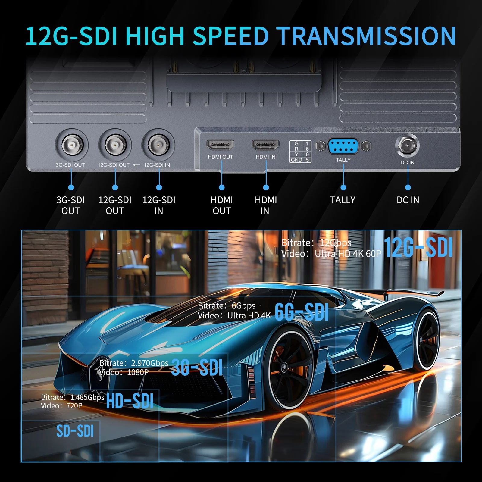 S10 obsługuje transmisję 12G-SDI (12 Gb/s) i jest kompatybilny wstecz z 6G-SDI, 3G-SDI, HD-SDI oraz SD-SDI. Pozwala również na jednoczesne przekazywanie sygnału (loop-out), co ułatwia budowę toru podglądu w ekipie. Dodatkowo wyposażono go w HDMI 2.0, dzięki czemu monitor sprawdza się jako uniwersalne narzędzie do monitoringu nowoczesnych źródeł 4K. Obudowa z aluminium CNC zwiększa trwałość i odporność w pracy terenowej.