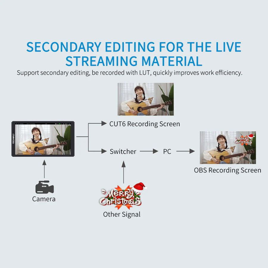 Różnica między CUT6 a zwykłymi monitorami polega na funkcji nagrywania przez USB 2.0, nagrywa obraz wideo do 1080p30 z kompatybilnych kamer, w formacie MP4 przez HDMI. Wystarczy podłączyć dysk flash USB (obsługuje format FAT32) i kliknąć czerwony przycisk nagrywania, aby rozpocząć nagrywanie. Czas nagrywania zależy od pojemności zewnętrznego nośnika pamięci, na przykład 1-godzinne nagranie transmisji na żywo zajmuje około 1860 MB pamięci.