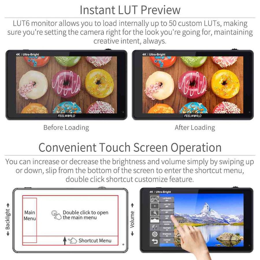 Monitor podglądowy LUT6 wykorzystuje standardy HLG 2020, HLG 709, HLG P3 HDR 3D LUT oraz tablice LUT Rec709 De-slog3, w tym SLOG2, SLOG3, LOGC, VLOG. Monitor może wyświetlać sygnał HDR (szeroki zakres dynamiczny), który umożliwia osiągnięcie niesamowitej czystości obrazu i szczegółów, upraszcza złożony proces nagrywania w trybie LOG i HDR i pomaga odtworzyć procesy postprodukcyjne w momencie, w którym jest to najbardziej potrzebne, czyli w trakcie filmowania.