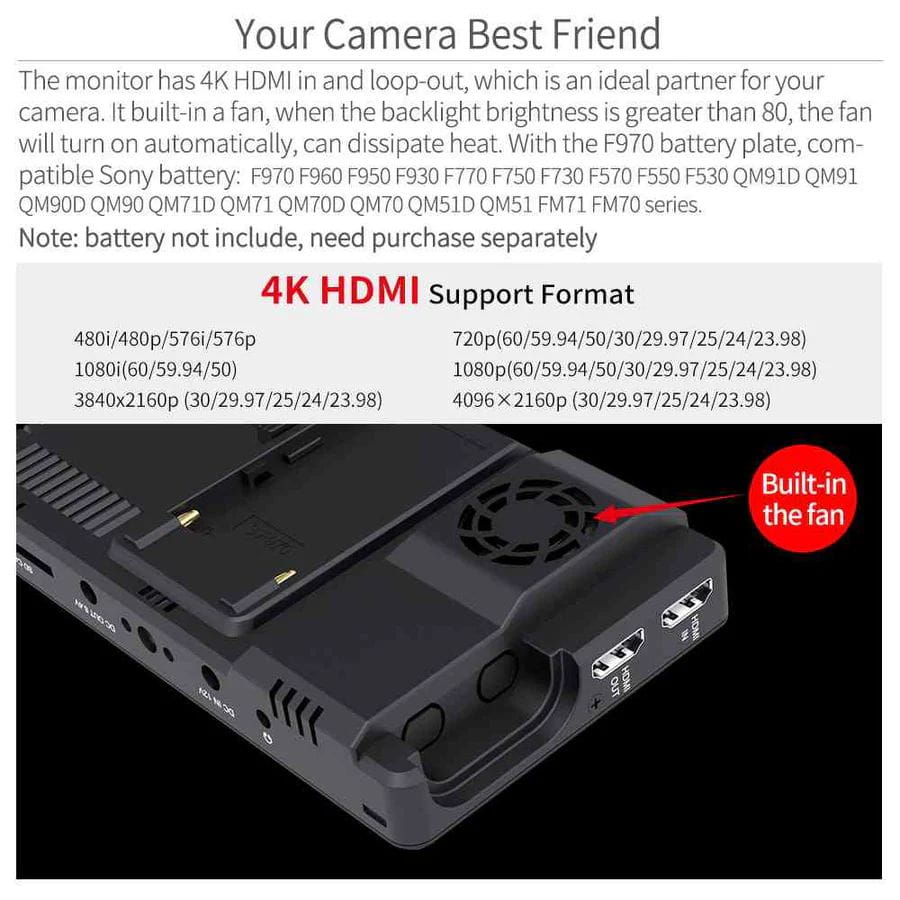 Compatible Battery: Sony F970, F960, F950,F930, F770, F750, F730, F570, F550, F530, series. Because the FEELWORLD LUT7S monitor is the ultra bright, we recommend use Sony F970 battery, two F970 batteries can use 4-5 hours.