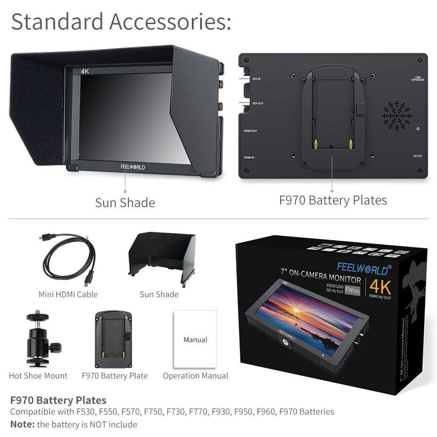 Kompaktowa konstrukcja FW703 zawiera wejście/wyjście 3G-SDI i 4K HDMI, USB, gniazdo na słuchawki 3,5 mm, wbudowany głośnik. Jego wejście SDI obsługuje wszystkie formaty SD, HD i SDI do 1080p 60 Hz i wejście HDMI obsługuje formaty do 4K 2160p 30 Hz, doskonałe wsparcie dla prawie wszystkich sygnałów.