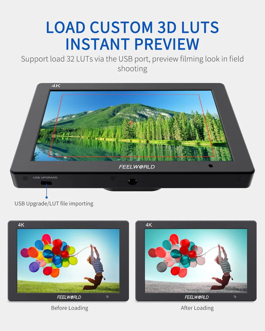 Funkcja ładowania LUT sprawia, że kalibracja kolorów jest łatwiejsza i bardziej intuicyjna, optymalizuje przepływ pracy i poprawia wydajność pracy na wczesnym etapie fotografowania. Można użyć 4 wbudowanych LOG do Rec.709 video lub wgrać pliki .cube (pojedynczy plik nie może przekraczać 7.9M, obsługuje pliki z LUT_3D_SIZE o rozmiarze 16, 17, 32, 33, 64, 65). Użytkownik przechowuje dokument LUT w katalogu głównym pendrive'a U, a importuje go poprzez podłączenie kabla adaptera USB i interfejsu USB urządzenia (można zaimportować do 32 własnych plików), zachowując twórczy zamysł, zawsze.