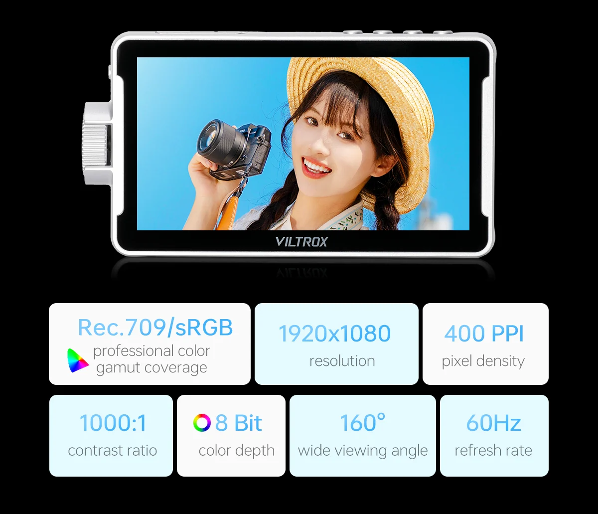 - Wyświetlacz Full HD IPS: 5,5-calowy ekran o rozdzielczości 1080P zapewnia realistyczne kolory i szerokie kąty widzenia na poziomie 160°, co gwarantuje dokładną kontrolę ujęć.