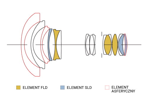 Jedna soczewka FLD (o charakterystyce odpowiadającej fluorytowi) i pięć szklanych soczewek SLD (Special Low Dispertion) z powodzeniem niwelują wszelkiego rodzaju aberracje zarówno w centrum, jak i na brzegach kadru. Trzy soczewki asferyczne, w tym soczewka asferyczna o dużej średnicy z przodu obiektywu, skutecznie zminimalizują efekt komy i flar, zapewniając fantastyczną rozdzielczość w całej rozciągłości kadru. Dotychczasowe powłoki antyodblaskowe super multi-layer coating zastosowano tym razem w połączeniu z nowo opracowaną technologią NPC (Nano Porous Coating)*. Obiektyw zaprojektowano w taki sposób, aby był mniej podatny na negatywne skutki fotografowania pod światło.