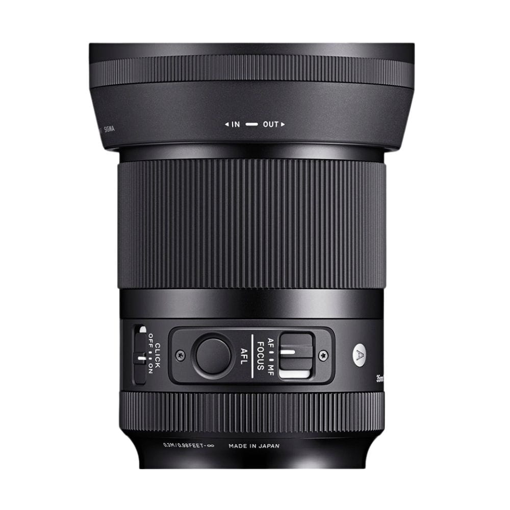 Na obudowie obiektywu SIGMA 35mm F1.4 DG DN | Art znajduje się pierścień przysłony, który umożliwia precyzyjną regulację wartości bezpośrednio z obiektywu lub za pomocą aparatu, gdy ustawiony jest w trybie Auto. Przełącznik blokady umieszczony na korpusie zabezpiecza pierścień przed niezamierzonymi zmianami, gwarantując stabilność ustawień podczas fotografowania. Dla filmowców dostępny jest także przełącznik „de-click”, umożliwiający płynną i cichą regulację przysłony, co pozwala na precyzyjne dostosowanie wartości podczas nagrywania. Dodatkowo, pierścienie działają z przyjemnym oporem, oferując tryb płynnej regulacji lub wyraźne kliknięcia, które można zablokować, aby uniknąć przypadkowych zmian.
