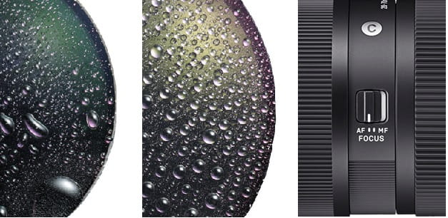 Obudowa SIGMA 35mm F1.4 DG DN | Art wyróżnia się wyjątkową trwałością, która pozwala na długotrwałe, profesjonalne użytkowanie. Konstrukcja odporna na kurz i zachlapania zapewnia skuteczne uszczelnienie przycisków oraz połączeń między elementami, a wokół mocowania umieszczono gumową uszczelkę dla dodatkowej ochrony. Przednia soczewka pokryta jest powłoką hydrofobową i olejoodporną, co sprawia, że jej czyszczenie jest szybkie i łatwe – zabrudzenia nie rozmazują się na całej powierzchni. Dzięki temu rozwiązaniu, obiektyw utrzymuje optymalną jakość obrazu nawet w trudnych warunkach, gwarantując niezawodność na lata.