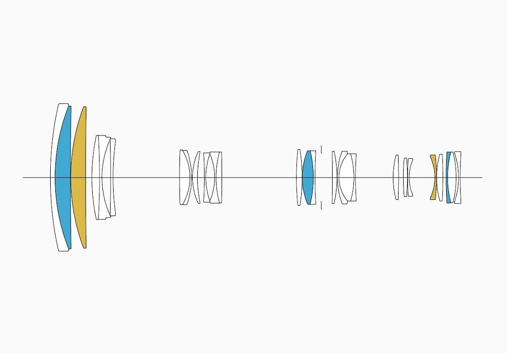 - Konstrukcja optyczna: 27 elementów w 19 grupach (w tym 2 soczewki FLD i 3 soczewki SLD)