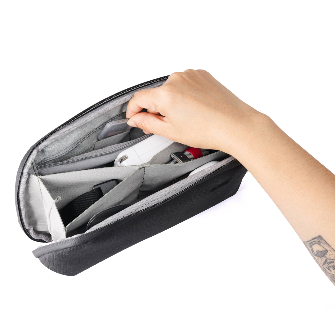 Wkład został wyposażony w 12 kieszeni, w tym elastyczne, zapinane na suwak przegródki na drobiazgi, pojedynczą pętlę na długopis oraz 4 większe kieszenie w stylu origami, które dostosowują się do przechowywanych przedmiotów. Dzięki elastycznym kieszeniom, Small Tech Pouch jest wystarczająco elastyczny, by pomieścić różnorodne akcesoria, a jednocześnie utrzymać kompaktowy rozmiar, jeśli zawartość nie wypełnia całkowicie torby.