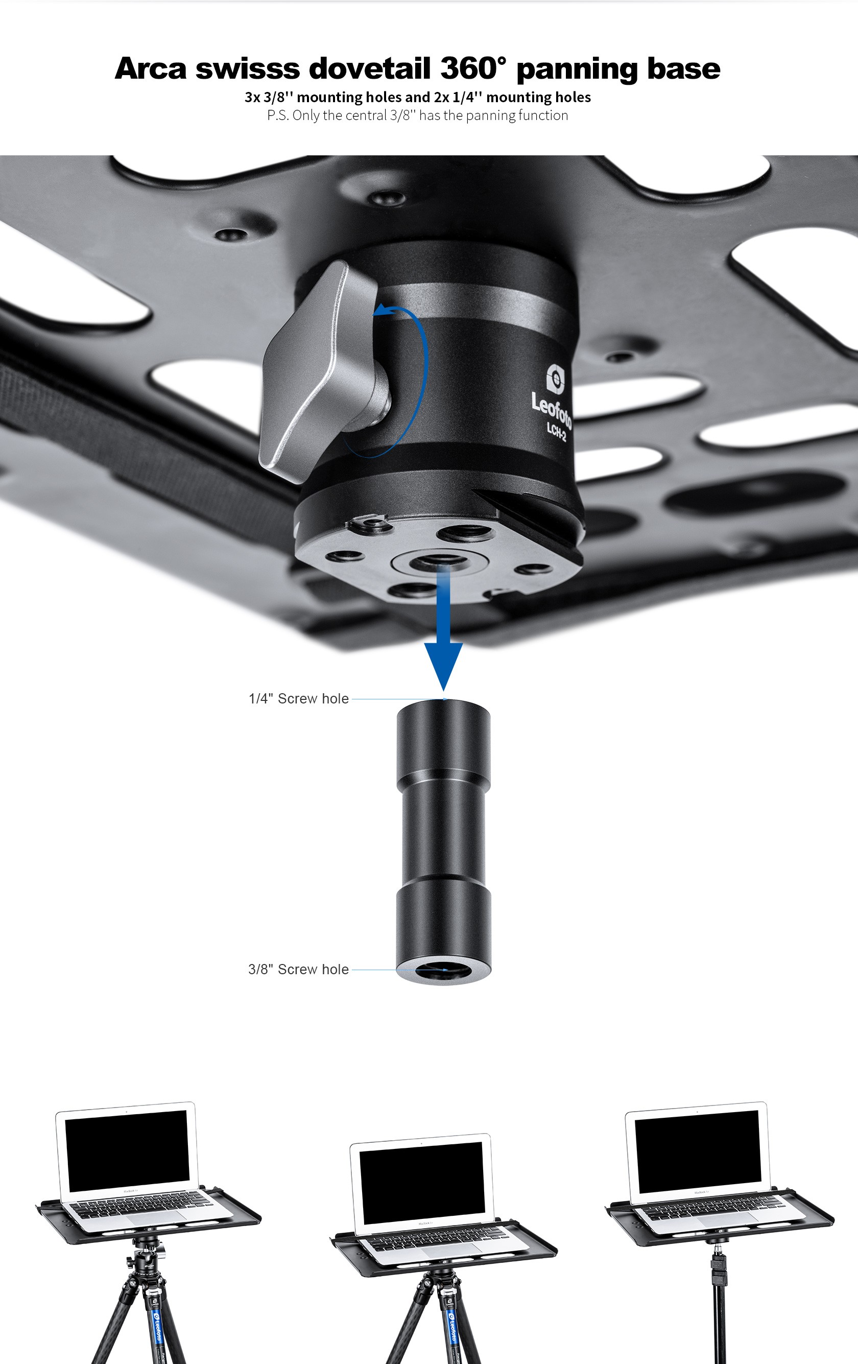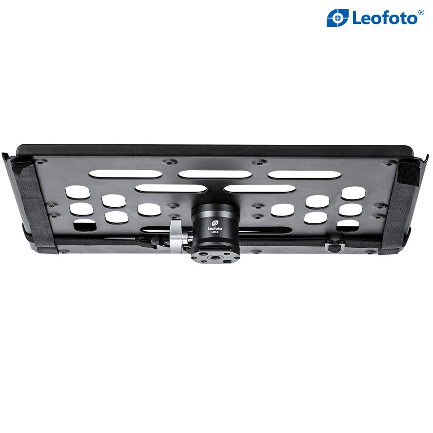 Leofoto LCH-2 to solidna, aluminiowa platforma robocza montowana na statywie, umożliwiająca wygodną pracę z laptopem w terenie. Dzięki systemowi Arca-Swiss i licznym gwintom montażowym sprawdza się zarówno w fotografii tetheringowej, jak i przy pracy studyjnej oraz plenerowej.