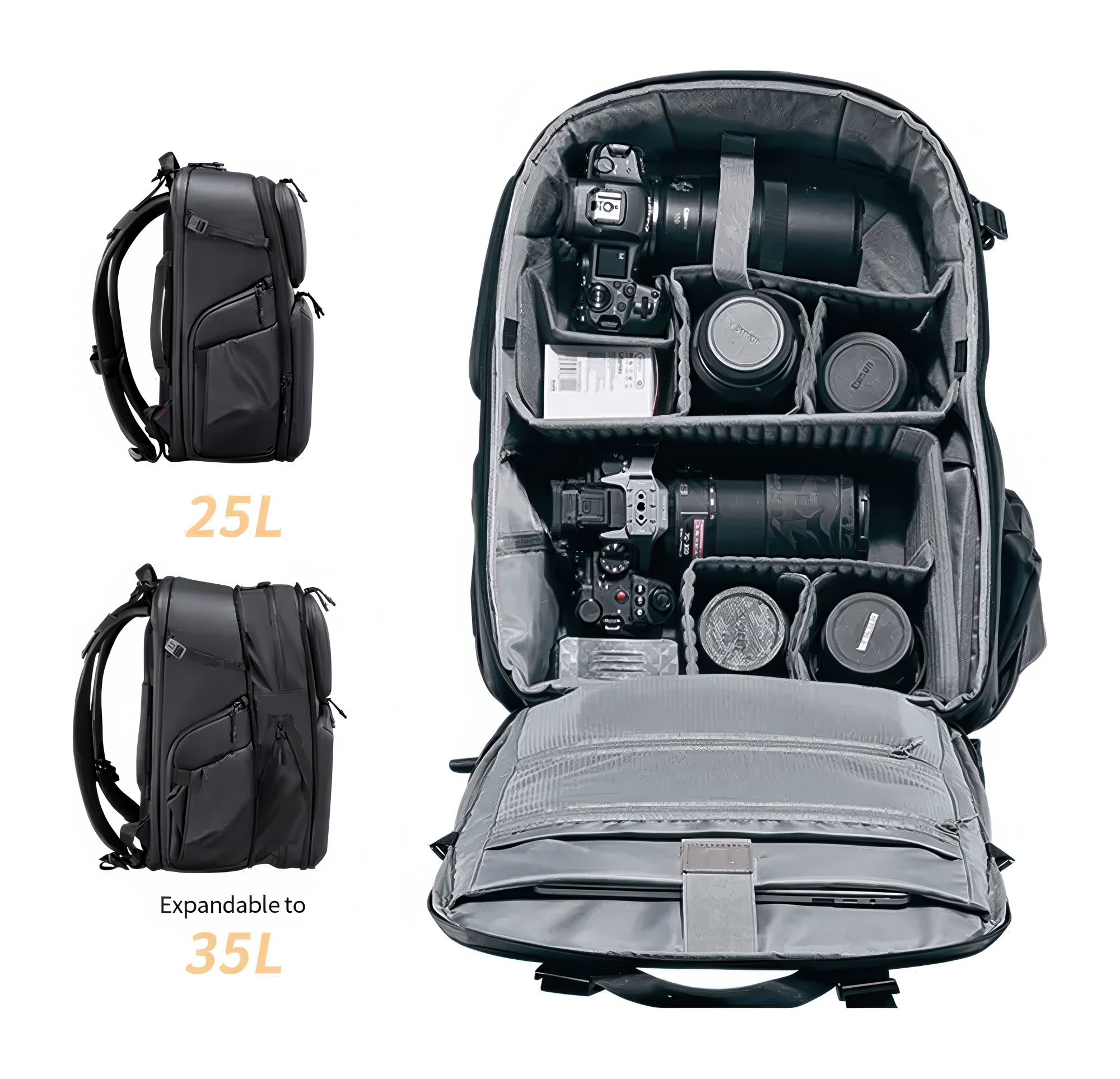 Dzięki pojemności 25 litrów, rozszerzalnej do aż 35 litrów, plecak pomieści cały Twój sprzęt fotograficzny – w tym nawet dwie lustrzanki i kilka obiektywów – i nadal znajdzie się miejsce na drobne akcesoria, odzież czy przekąski. Regulowane przegrody zapewniają elastyczną organizację, więc możesz z powodzeniem dostosować wnętrze do własnych potrzeb. To właśnie jest komfort w najbardziej praktycznym wydaniu! Ten plecak powstał po to, byś mógł/mogła zabrać na wyprawę wszystko, co niezbędne.