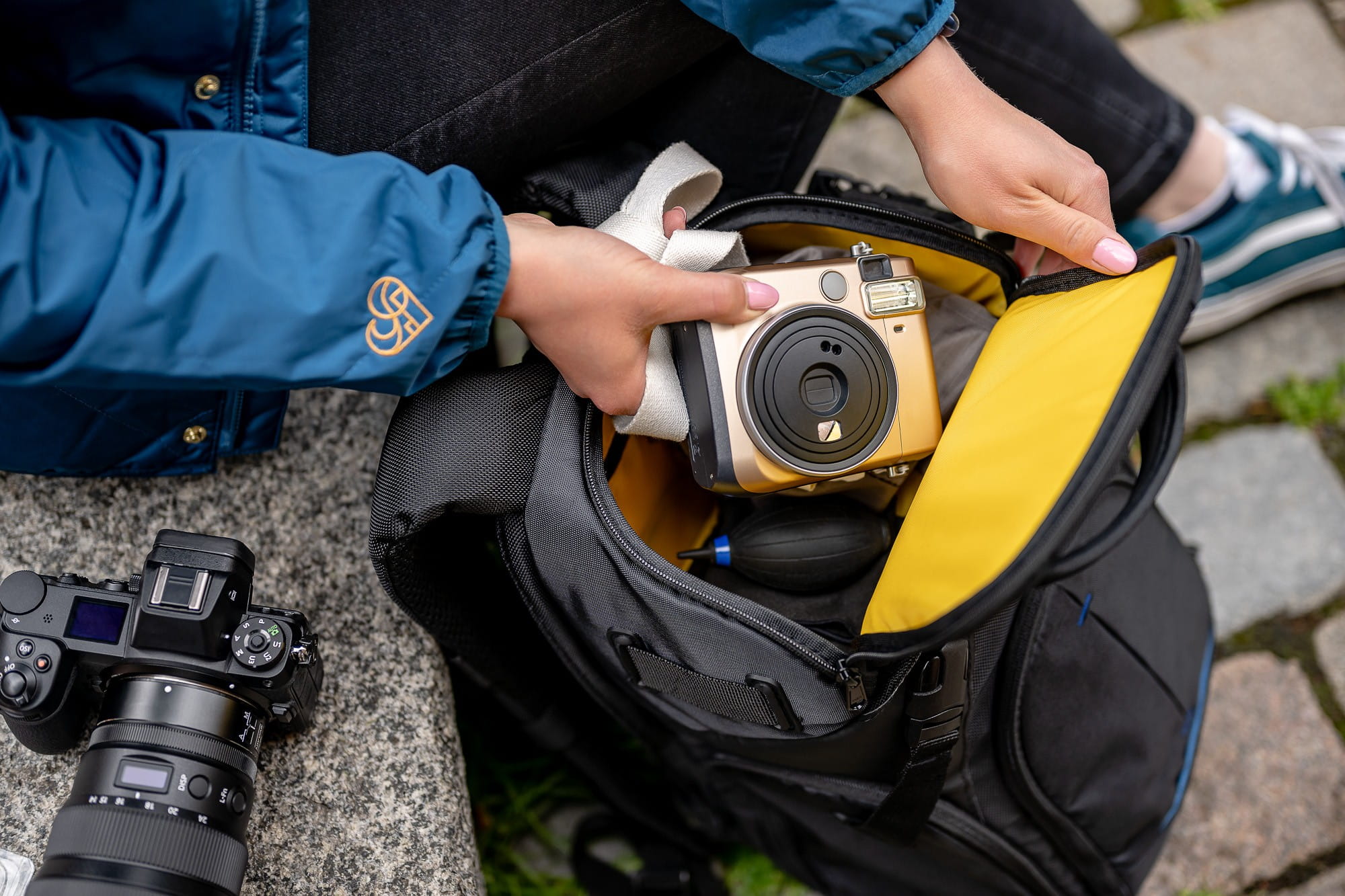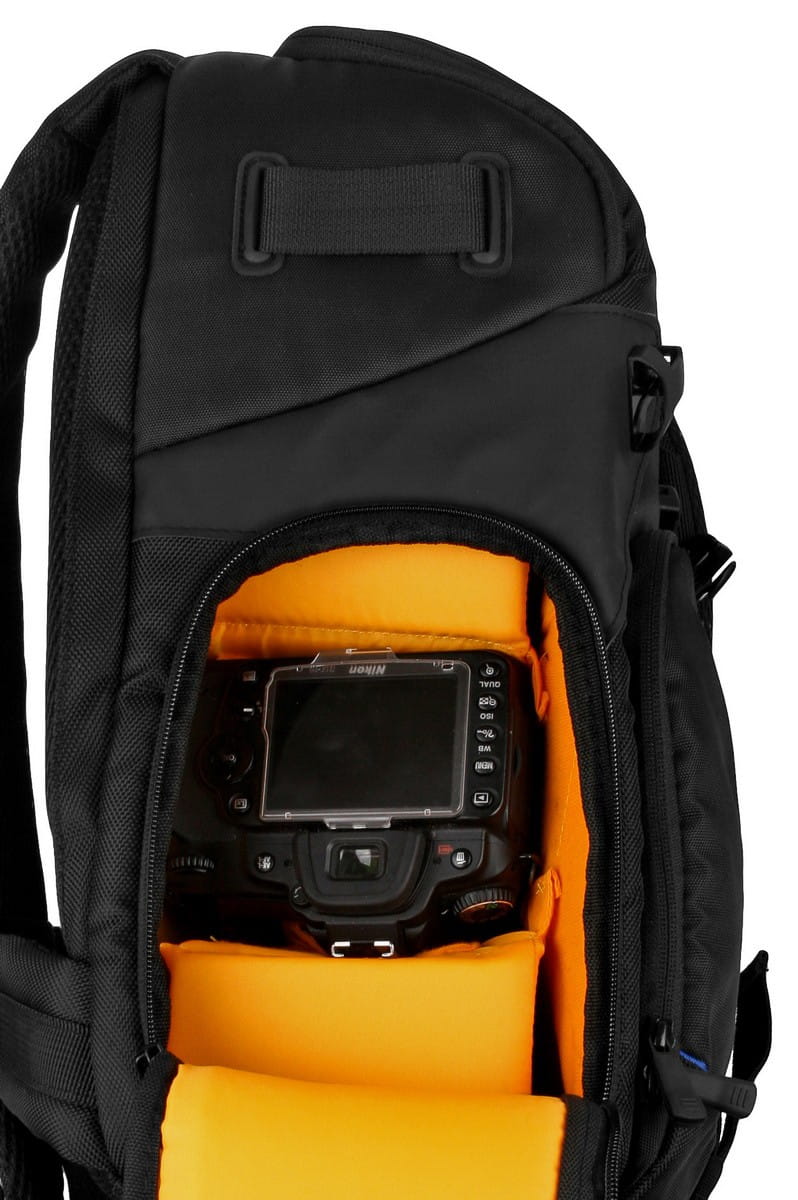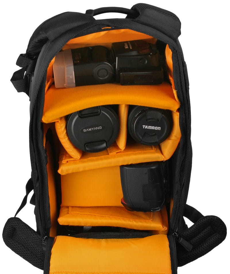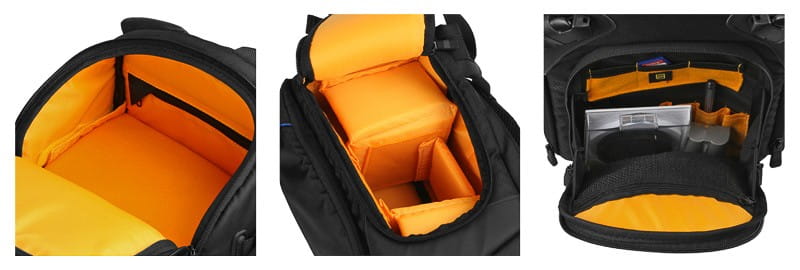 Plecak wyposażony został w komorę główna oraz dwie kieszenie, przednią oraz górną. W głównej komorze pomieści się lustrzanka z obiektywem (również z teleobiektywem), dodatkowe 2-3 obiektywy, lampa błyskowa, zapasowy korpus. Przednia kieszeń idealnie nadaje się do przechowywania akcesoriów takich jaki filtry, redukcje czy zapasowe akumulatorki. W górnej kieszeni możemy schować prowiant, dodatkowy ubiór lub także sprzęt fotograficzny (pomieści np. dwa obiektywy lub lampę błyskową).