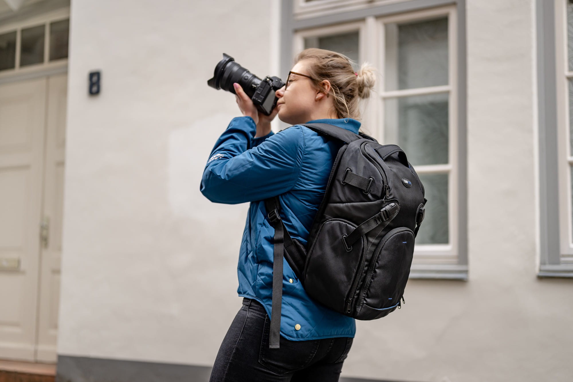 Plecak wyposażony został w wygodne, regulowanej długości szelki z pasem ściągającym na wysokości piersi oraz rączkę w górnej części. W komplecie znajduje się pasek za pomocą którego możemy przyczepić statyw z prawego lub lewego boku plecaka.