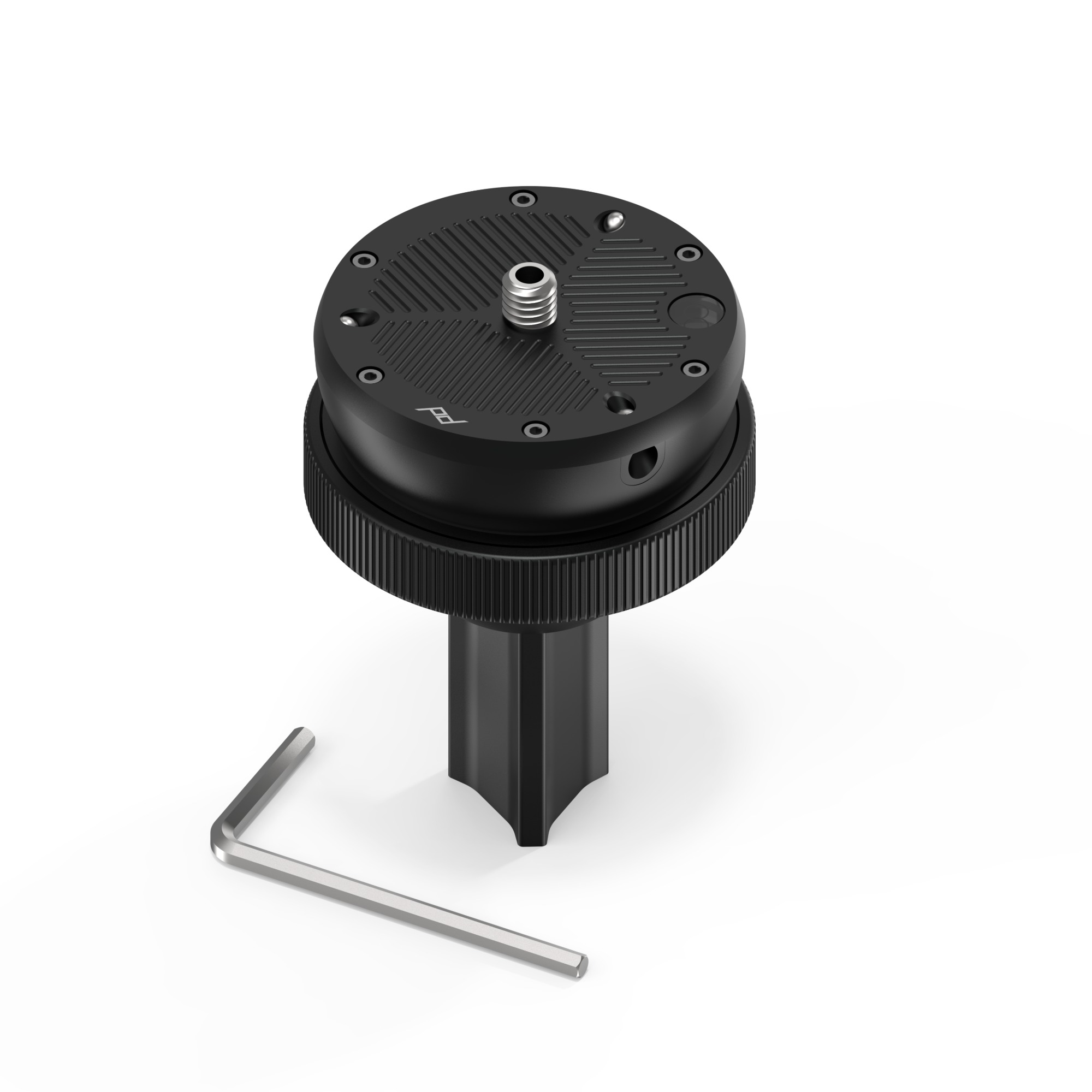 Instalacja podstawy poziomującej Pro jest szybka i łatwa – aby zainstalować ją bez użycia narzędzi, wystarczy zdjąć głowicę kulową Pro i kolumnę centralną, a następnie włożyć podstawę poziomującą Pro. Jeśli chcesz użyć kolumny centralnej, zdejmij głowicę kulową Pro za pomocą jednej śruby sześciokątnej i zainstaluj podstawę poziomującą Pro w jej miejsce za pomocą tej samej śruby, używając narzędzia dołączonego do naszego statywu. Następnie zainstaluj głowicę innej firmy na mocowaniu 3/8″. Zapewnia regulację poziomu w zakresie +/-20 stopni we wszystkich kierunkach.
