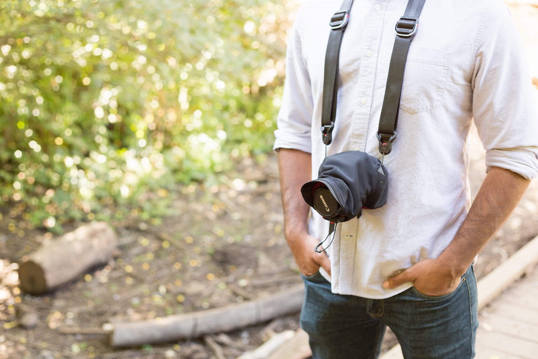 Dzięki wyciętym otworom na pasek pokrowiec SHELL może być używany zarówno z oryginalnym paskiem od aparatu jak i paskami Peak Design.