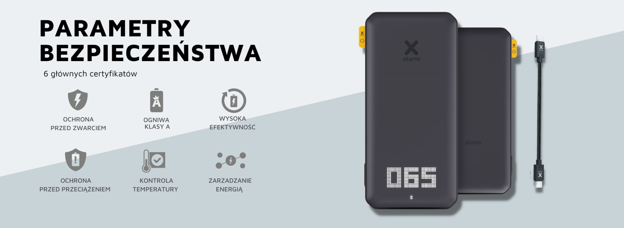 - Bateria klasy A. Xtorm używa tylko najlepszych ogniw, które spełniają wszystkie wymogi bezpieczeństwa, aby zapewnić szybkie ładowanie urządzeń.