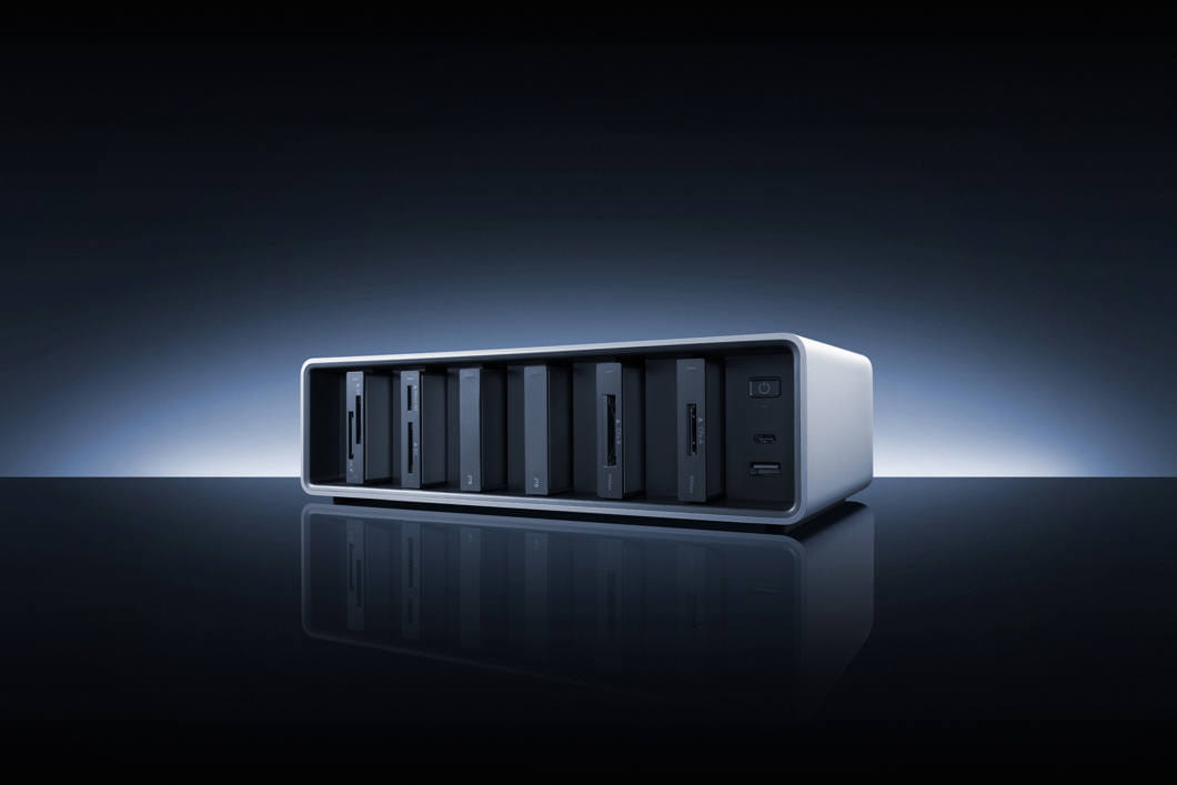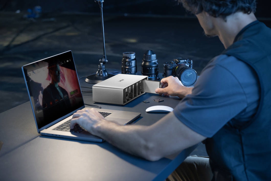 Sześć modułowych zatok: Umożliwiają dostosowanie stacji do indywidualnych potrzeb poprzez instalację różnych czytników kart pamięci i przenośnych dysków SSD, co przyspiesza proces postprodukcji.