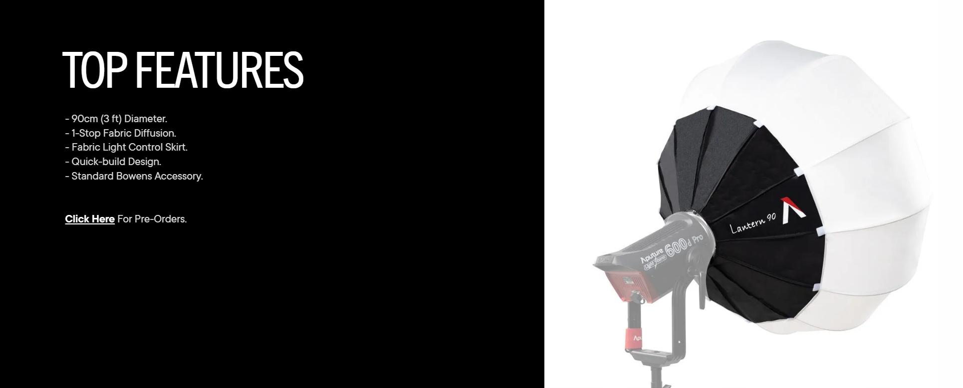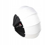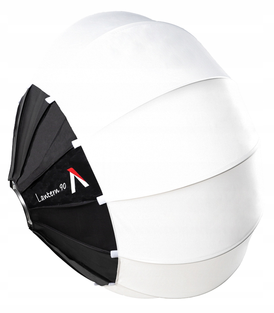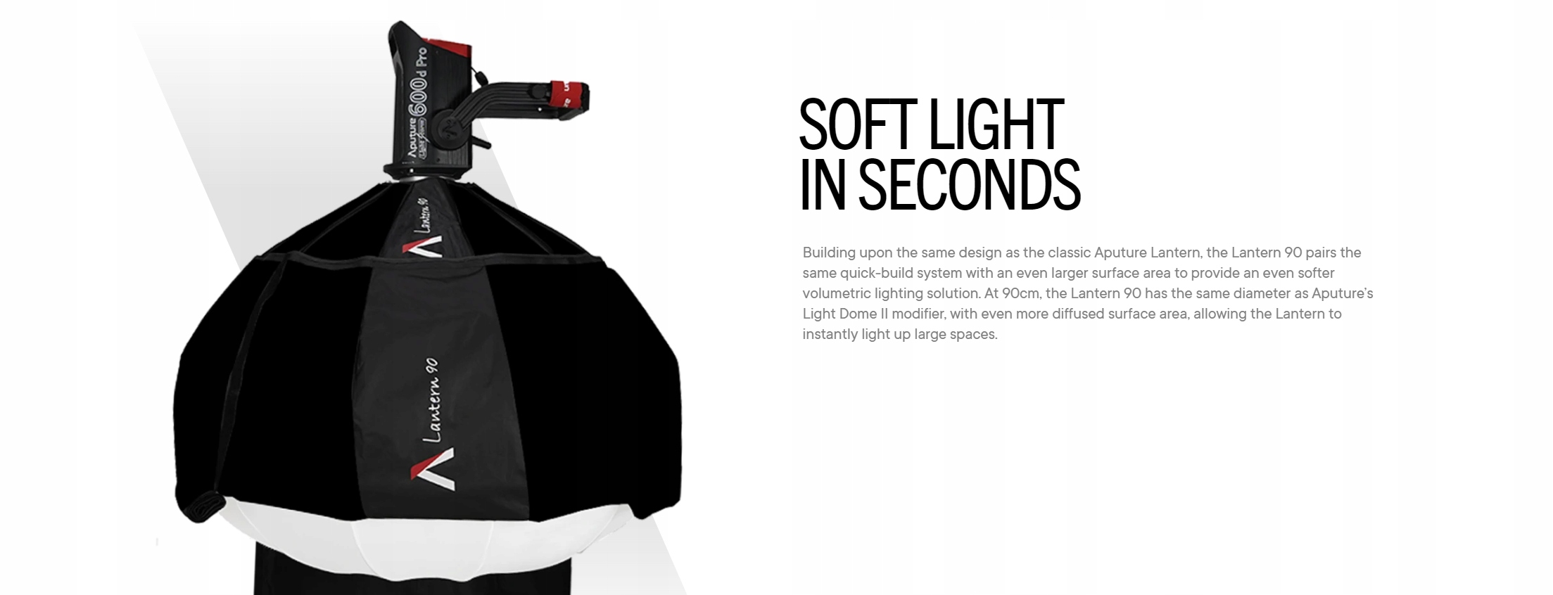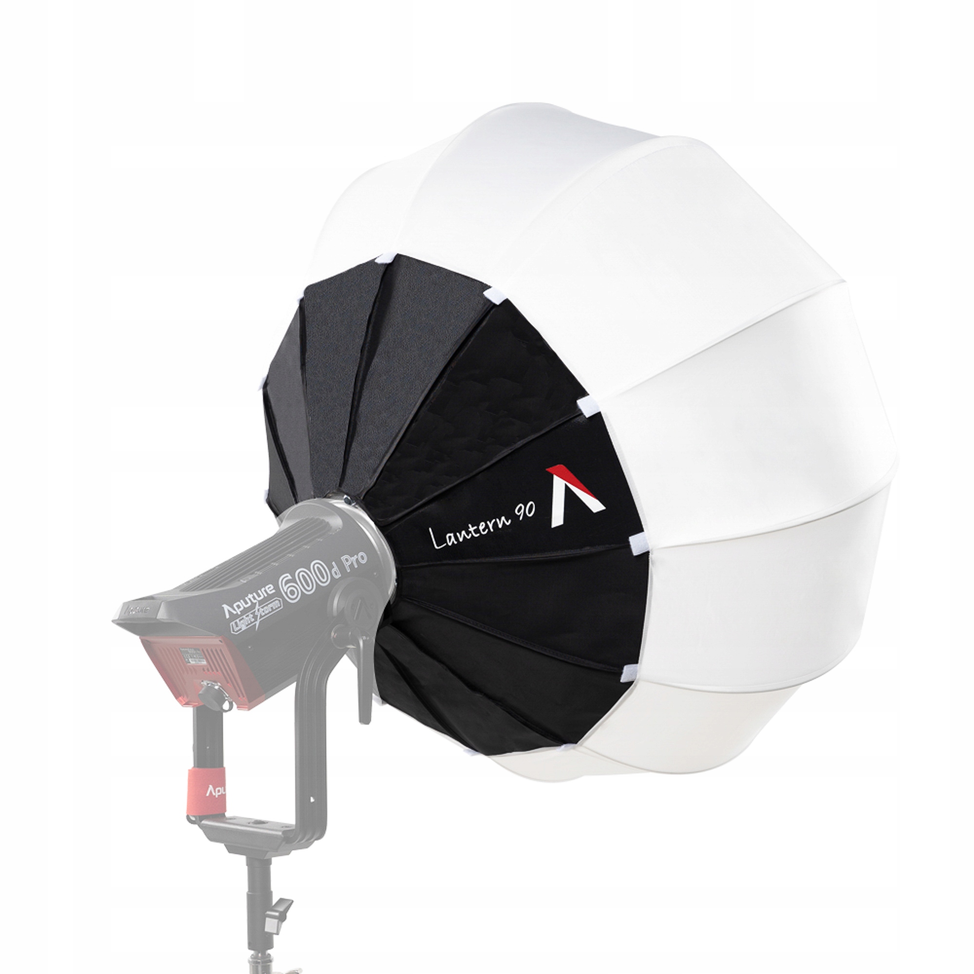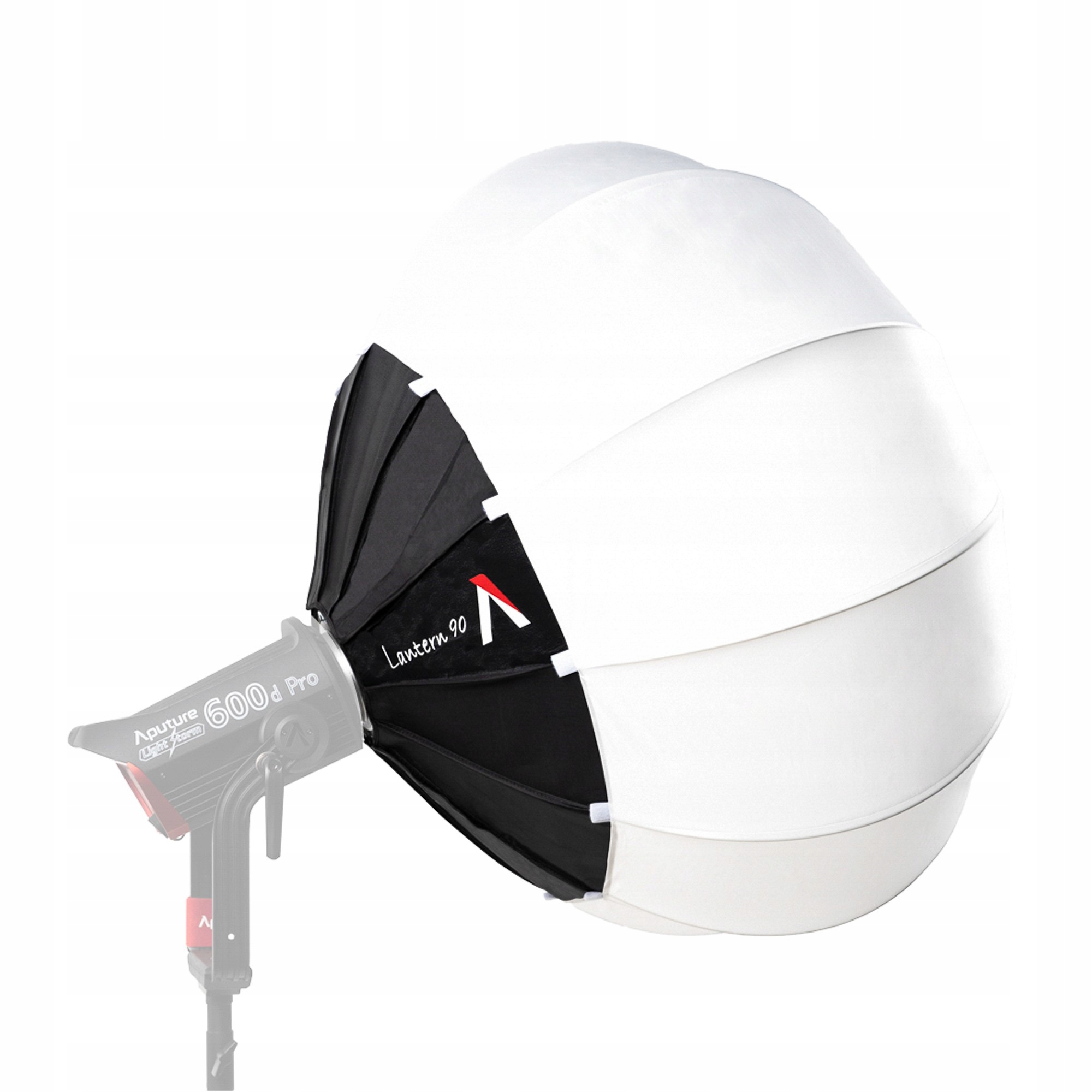 Unikalny kulisty kształt sferycznego softboxa Aputure Lantern 90 pozwoli Ci uzyskać miękkie i przyjemne dla oka światło o promieniu 270º. Strata światła na dyfuzorze wynosi tu - 1 EV. Modyfikator z powodzeniem wykorzystasz zarówno w studiu fotograficznym, jak i na planie filmowym.