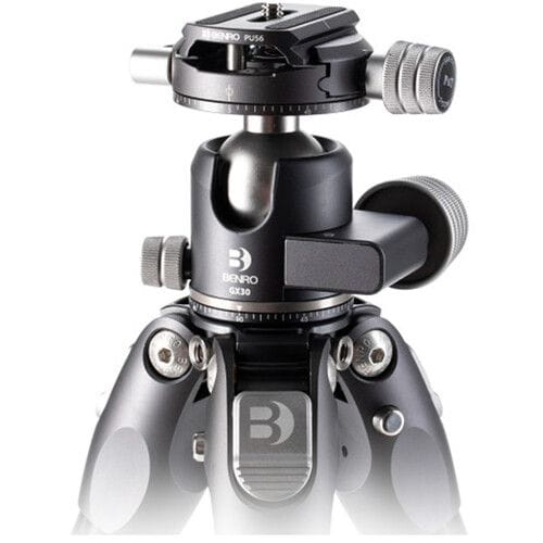 Głowica kulowa GX30: Niskoprofilowa głowica wyróżnia się podwójnym trybem panoramowania – tradycyjnie u podstawy oraz pod szybkozłączką. Sterowanie odbywa się za pomocą jednego pokrętła, które reguluje moc tarcia i niezależnie blokuje obrót głowicy.
