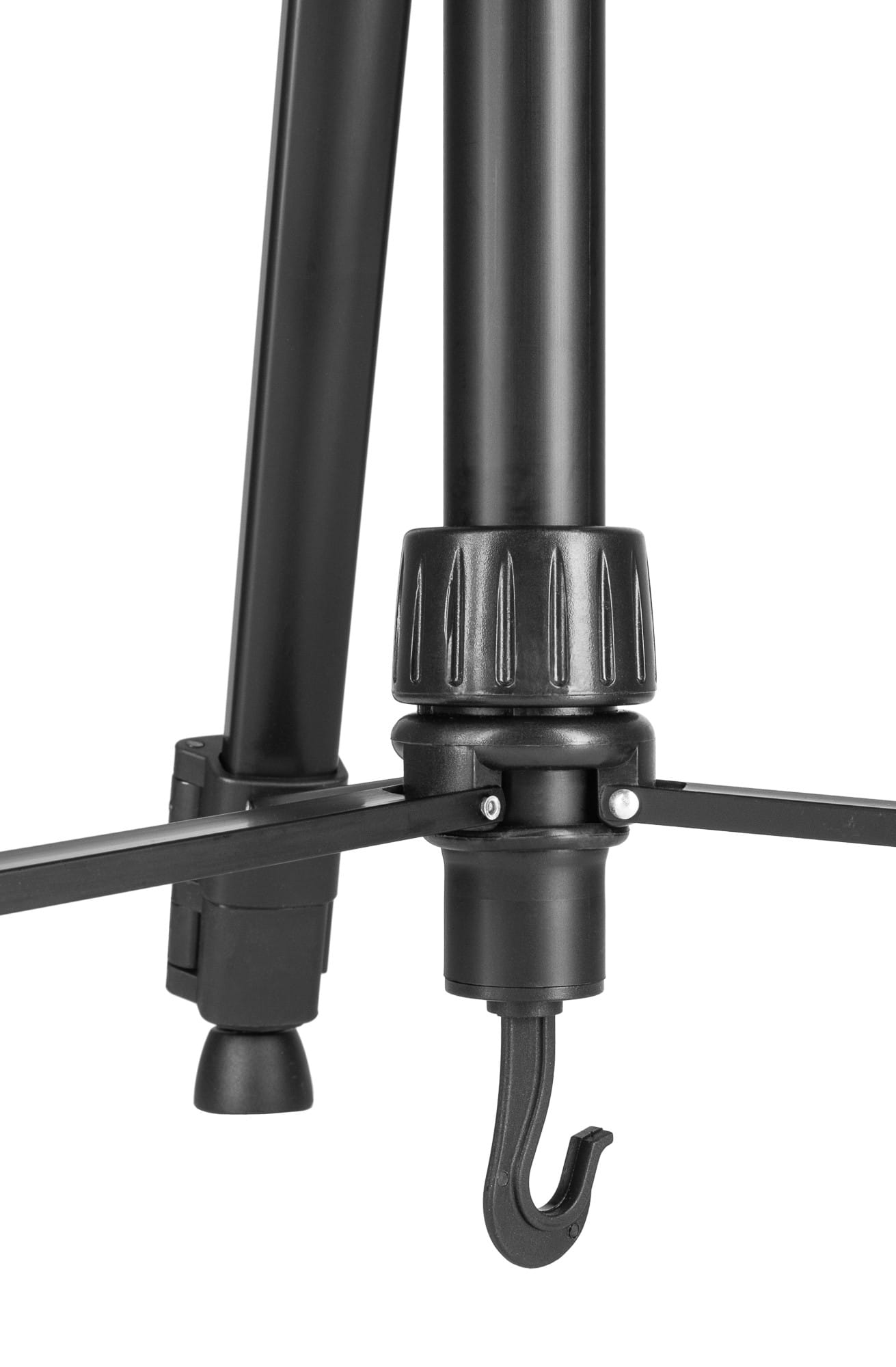 Statyw posiada też hak do przywieszenia obciążenia oraz stopki z przegubami znacznie poprawiające stabilność.