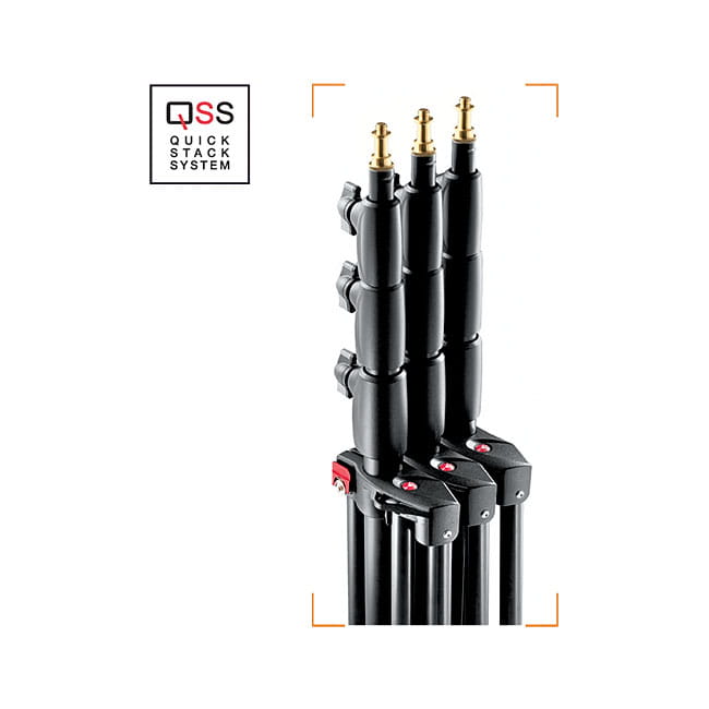 Manfrotto 1051BAC to lekki i wytrzymały statyw oświetleniowy, zaprojektowany z myślą o łatwym transporcie i szybkim montażu. Dzięki systemowi amortyzacji powietrznej zapewnia płynne opuszczanie sekcji, chroniąc zamontowane urządzenia przed nagłymi upadkami. Innowacyjny mechanizm Quick Stack System (QSS) umożliwia łączenie kilku statywów w jeden zestaw, co ułatwia ich przenoszenie i przechowywanie.
