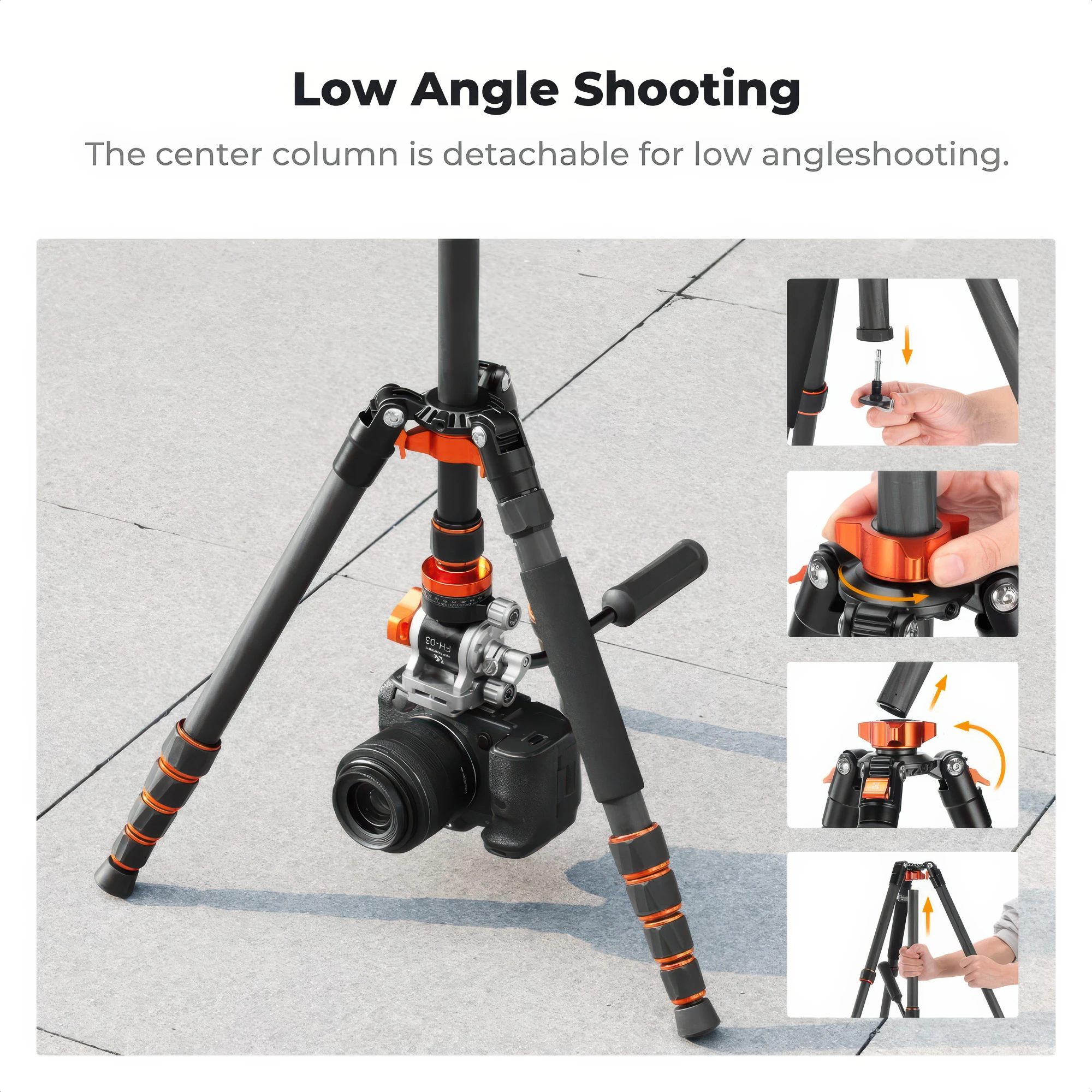 Kolumna centralna, którą zastosowano w modelu K&F Concept O255C4 to nie tylko sposób na zwiększenie maksymalnej wysokości statywu, ale też praktyczne narzędzie do pracy w trudniejszych warunkach. Na jej dolnym końcu znajduje się hak, umożliwiający zawieszenie obciążenia, które poprawi stabilność całej konstrukcji. Będzie to szczególnie przydatne podczas wietrznej pogody lub pracy w terenie. Co więcej, kolumnę można zamontować odwrotnie, co umożliwia fotografowanie tuż nad ziemią – idealne do zdjęć makro, ujęć detali czy filmowania z bardzo niskiej perspektywy.