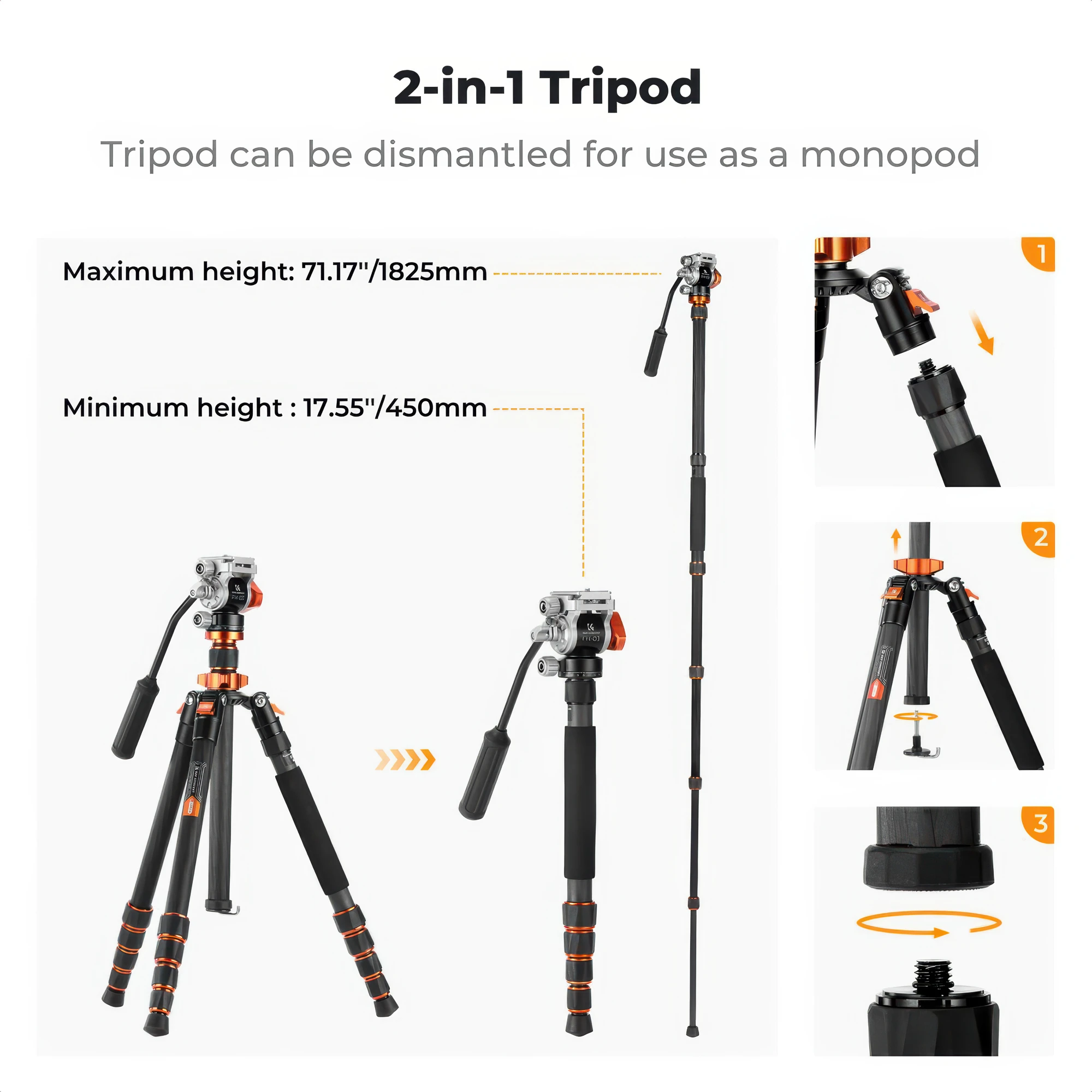 Jedną z nóg statywu K&F Concept O255C4 możesz w kilka chwil przekształcić w pełnoprawny monopod, który – po połączeniu z głowicą – osiąga imponującą wysokość 182,5 cm. To doskonałe rozwiązanie w sytuacjach, gdzie nie ma miejsca na rozstawienie statywu lub liczy się szybka reakcja – na koncercie, w tłumie czy podczas dynamicznego reportażu. Monopod zapewnia większą mobilność, a jednocześnie stabilizuje ujęcia w sposób nieosiągalny dla zdjęć z ręki.