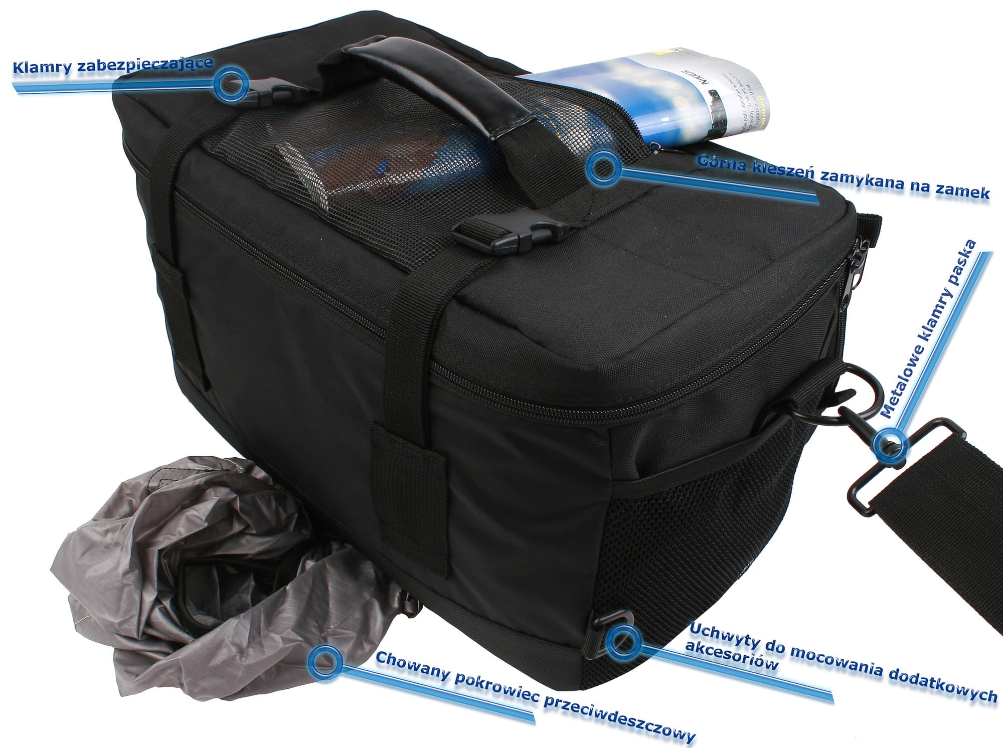 - dodatkowe kieszenie i przegródki wewnątrz torby.
