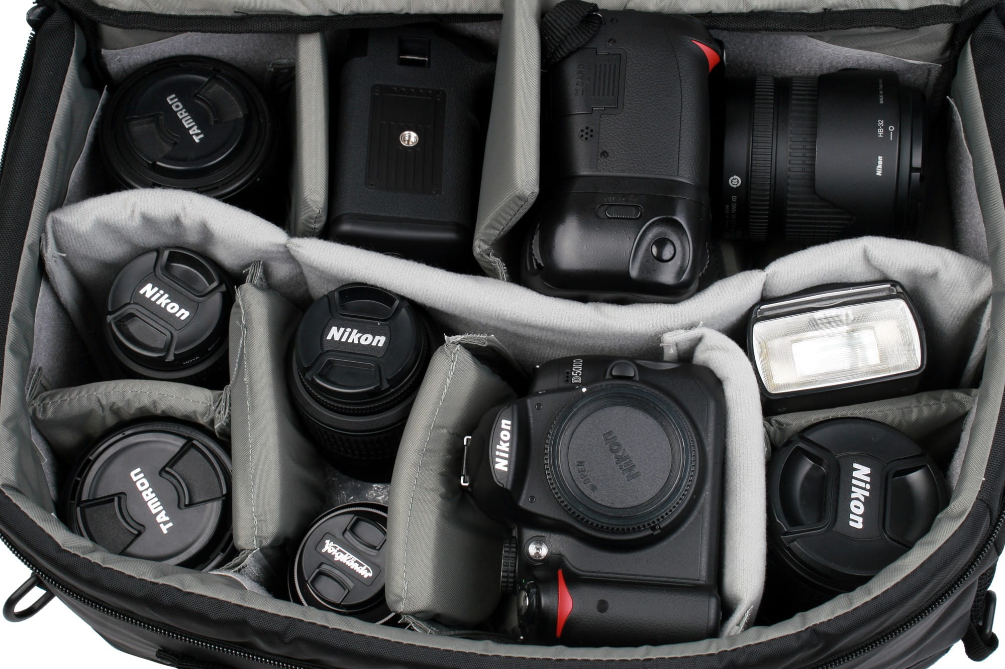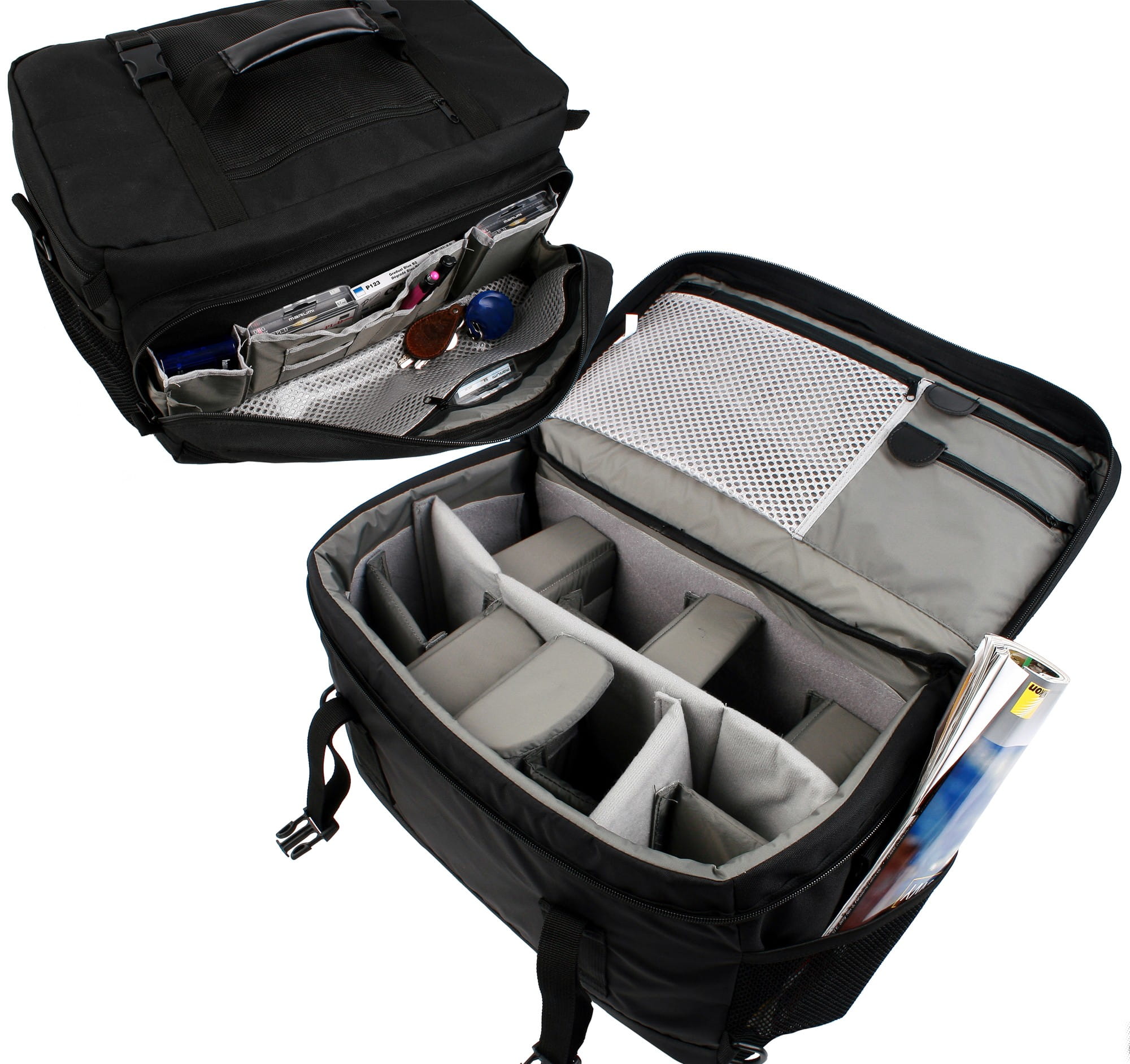 Komora główna, dzięki przestawialnym przegrodom, może być dowolnie konfigurowana i dzielona nawet na 14 części. Dowolna konfiguracja zapewnia optymalne wykorzystanie przestrzeni oraz perfekcyjne dopasowanie do sprzętu i potrzeb użytkownika. Torba pomieści 2 korpusy, 8 obiektywów, lampę błyskową oraz szereg innych akcesoriów takich jak: aparat kompaktowy, kamera, filtry, ładowarki, piloty, akumulatory, czytniki itp.