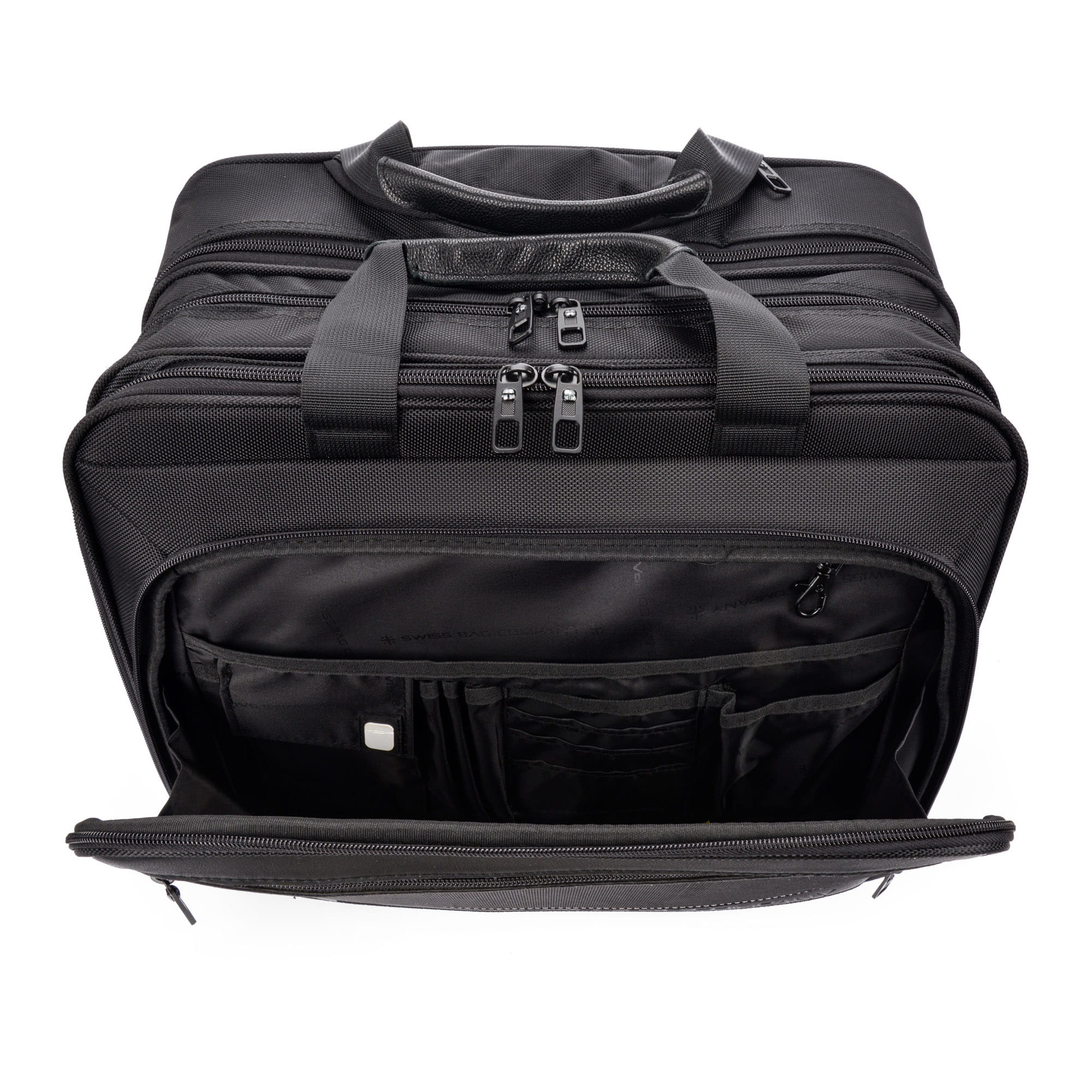 Torba pilotka na kółkach SwissBags Schwyz to nowoczesna torba biznesowa na kółkach, która posłuży w podróży pociągiem czy samochodem. Jej wymiary 37x41x25cm odpowiadają wymogom większości linii lotniczych, dlatego można potraktować ją także jako bagaż podręczny podczas podróży samolotem.
