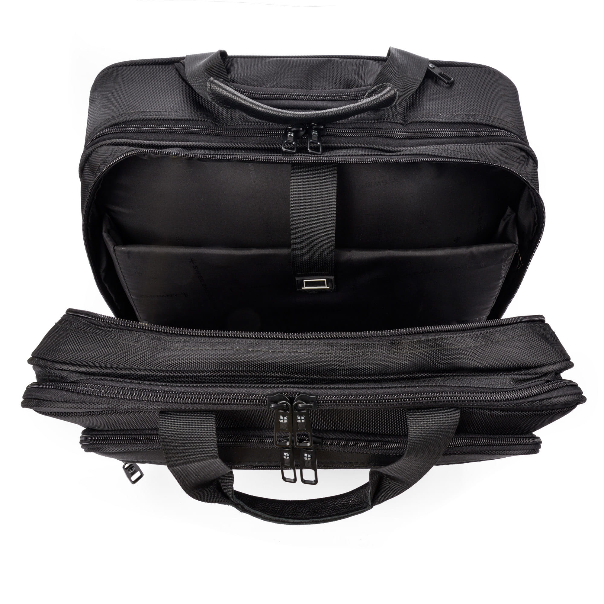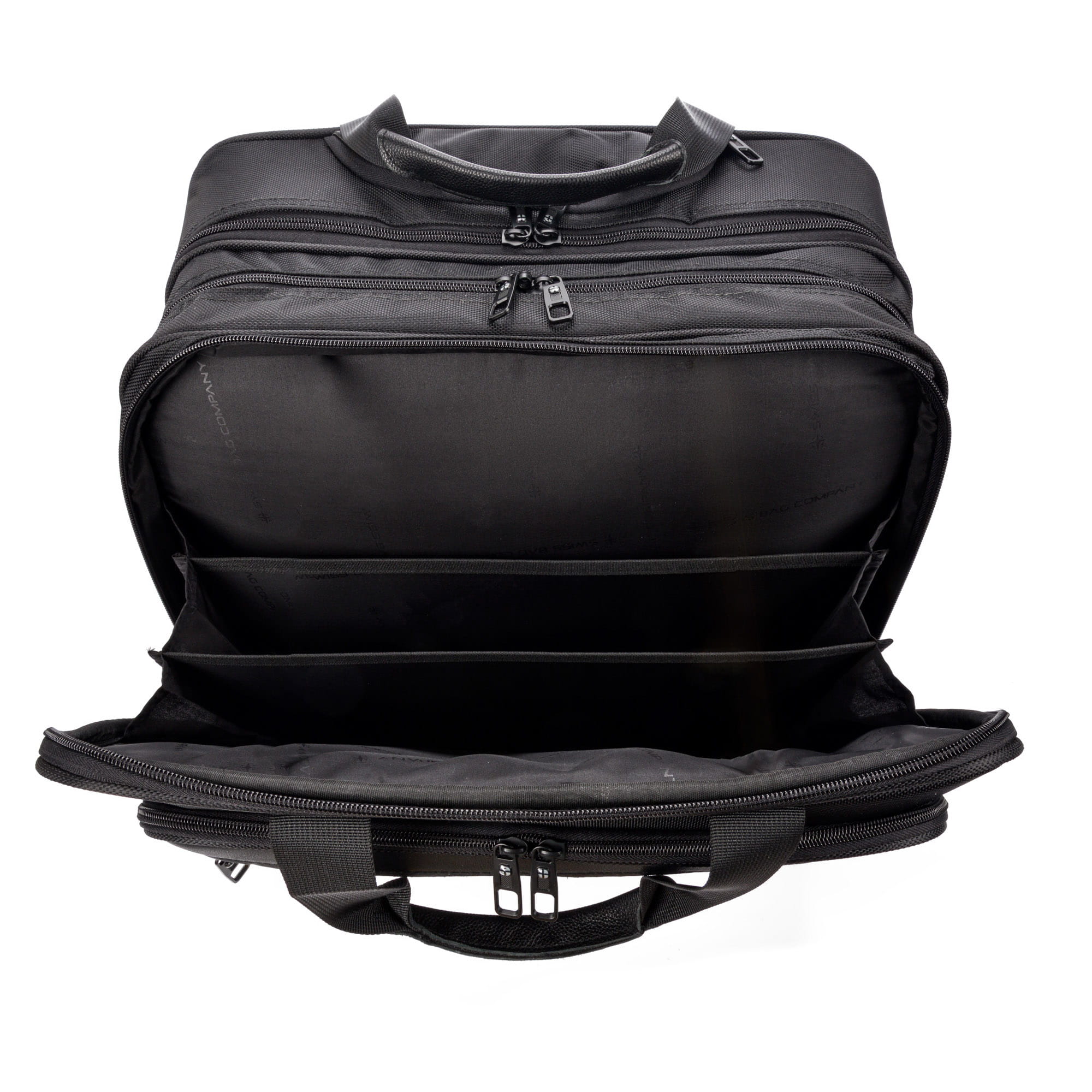 W największej kieszeni znajduje się miejsce na ubrania, które z łatwością możemy spiąć taśmami spinającymi. Z boku umieszczono dwa zapięcia, dzięki którym można regulować wielkość dostępu do kieszonki. Druga przegródka zawiera rozdzielacz na dokumenty, foldery i inne ważne artykuły biurowe. Pozwala na łatwą organizację miejsca i zachowanie porządku. Trzecia komora posiada usztywnione miejsce na laptop do 16" wyściełane gąbką, by jak najlepiej zabezpieczyć urządzenie przed uszkodzeniami. Duża kieszeń z przodu zamykana na suwak posiada panel organizacyjny: jedną większą przegródkę, dwie kieszenie na urządzenie elektroniczne typu telefon, wizytówki, długopisy i brelok na klucze.