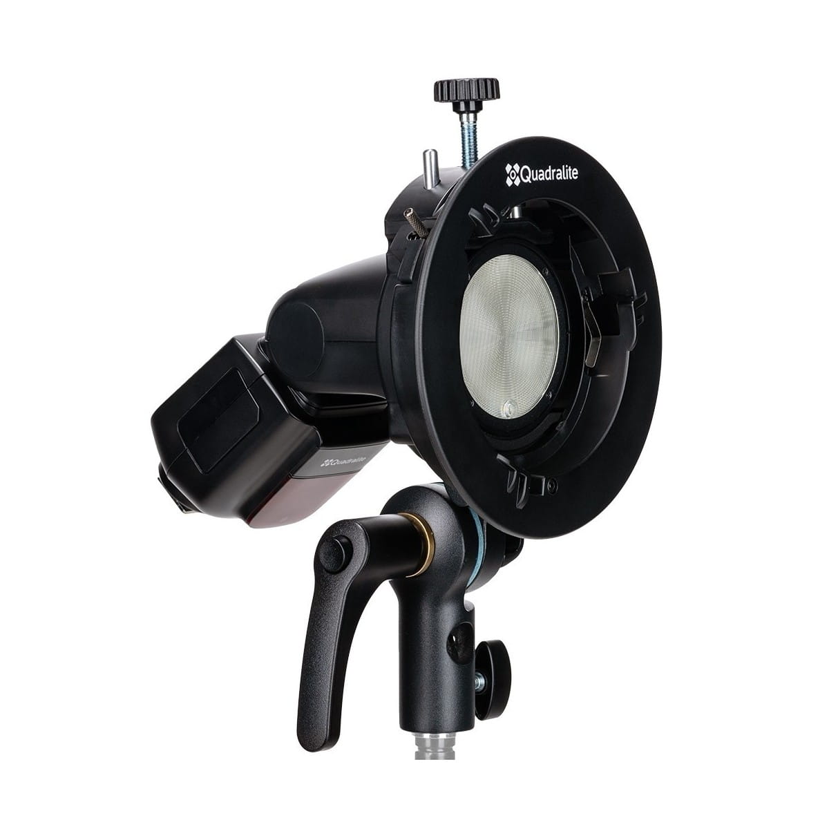 Quadralite Reporter S2-holder to lekki i poręczny uchwyt do lamp reporterskich typu speedlite, który pozwala korzystać z modyfikatorów światła do lamp studyjnych z mocowaniem Bowens.