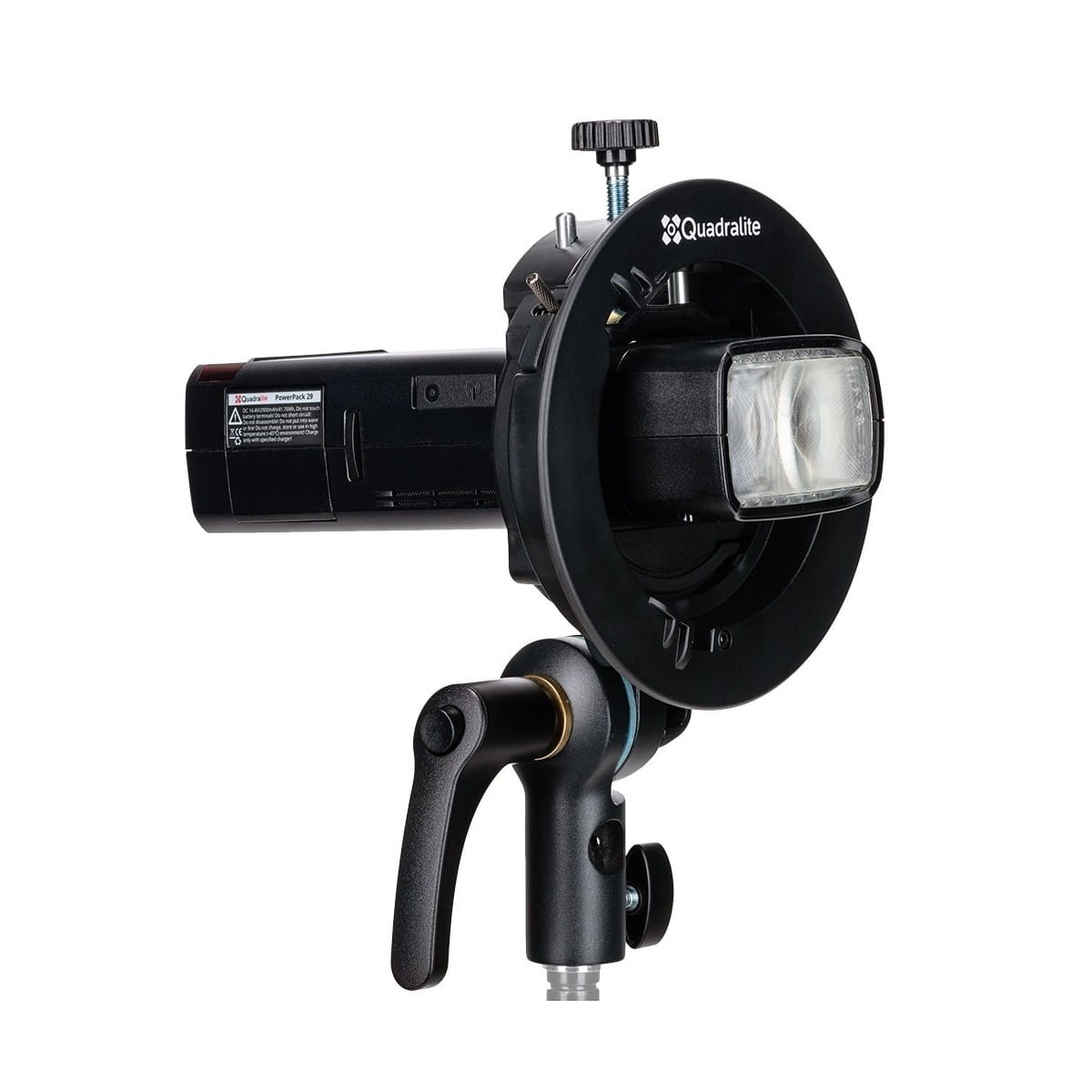 Quadralite Reporter S2-holder wyposażony jest w niezwykle użyteczny uchwyt mocujący lampę za pomocą zacisku obejmującego jej głowicę. Jest to rozwiązanie znacznie bezpieczniejsze, uniwersalne i zapewniające lepsze wykorzystanie światła flesza, niż w przypadku mocowania z użyciem gorącej stopki. Daje to też możliwość swobodnego zamontowania wyzwalaczy radiowych bezpośrednio do stopki lampy i niweluje konieczność stosowania dodatkowych przewodów.