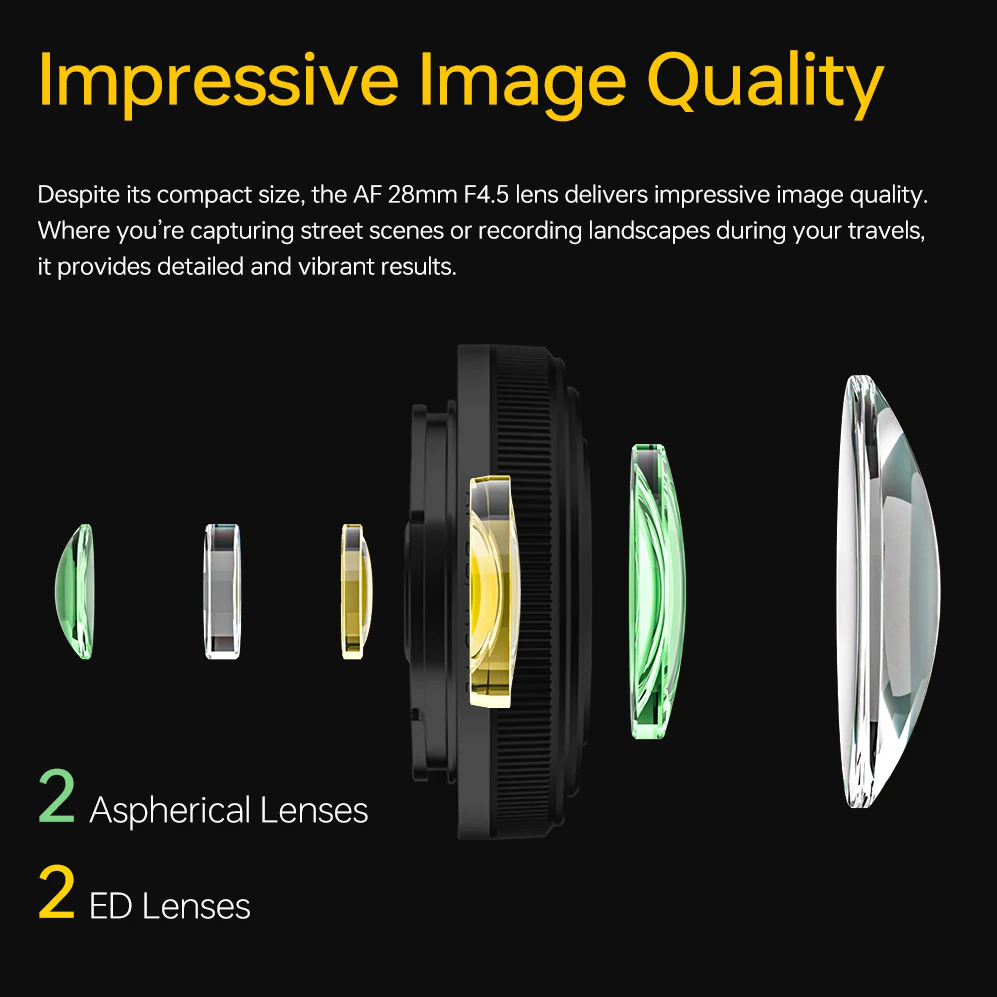 Ważący zaledwie 60 g i mający grubość zaledwie 15,25 mm obiektyw AF 28 mm f/4.5 XF został zaprojektowany z myślą o bezproblemowym fotografowaniu w podróży aparatami Fujifilm z serii X.