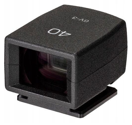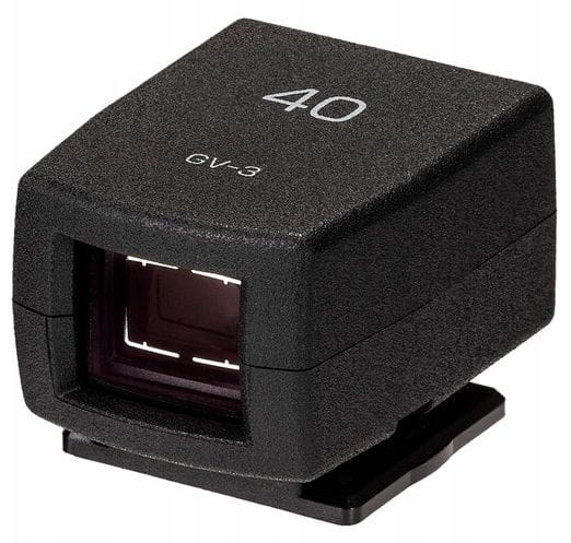 GV-3 mocuje się do korpusu aparatu za pomocą gorącej stopki i przechowuje w dołączonym etui, gdy nie jest używany. Najważniejsze cechy GV-3 to ramka 40 mm i znaczniki proporcji 1:1.
